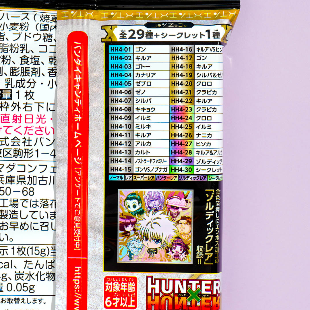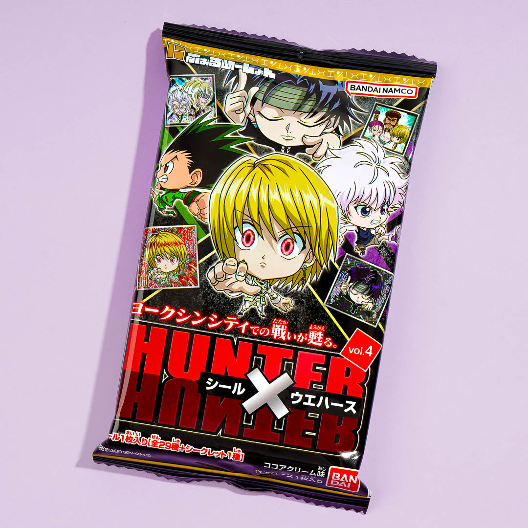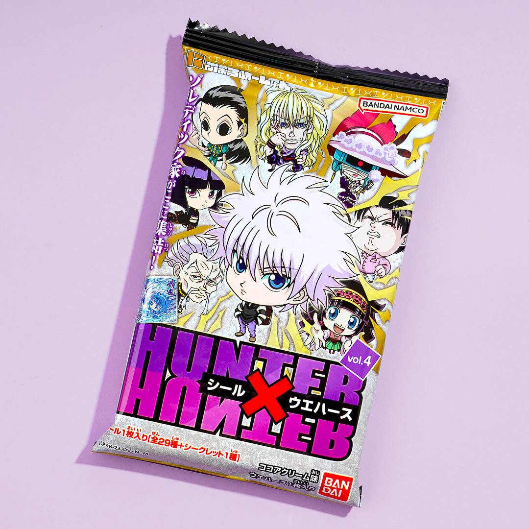 This yummy chocolate-flavored wafer comes with the 4th edition of Hunter x Hunter stickers! The sticker features an illustration of the anime characters that appear mainly in the story of Zoldyck family, election, and Yorkshin City.