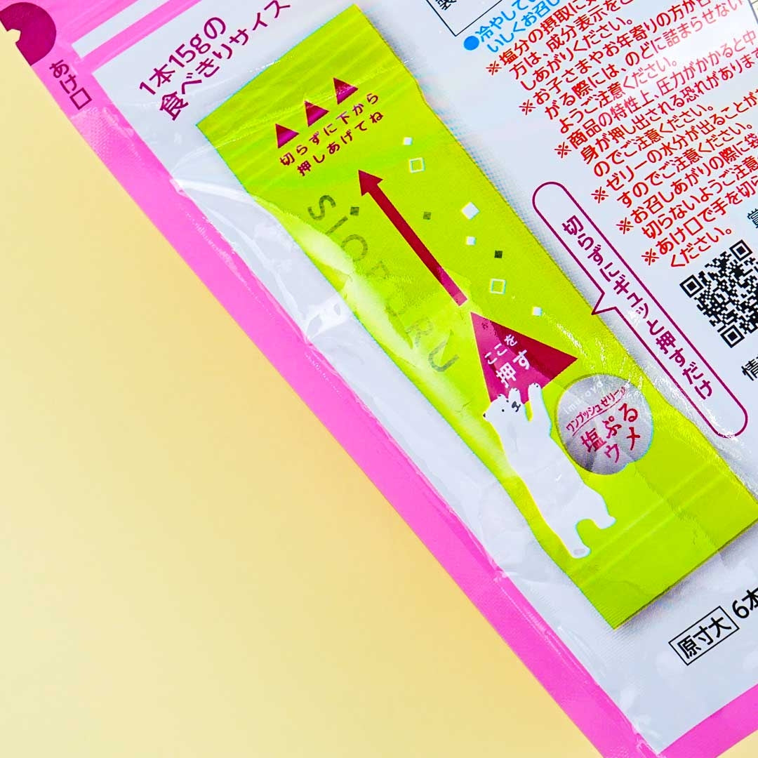 A resealable pack of one-push jellies made with sea salt and plum juice