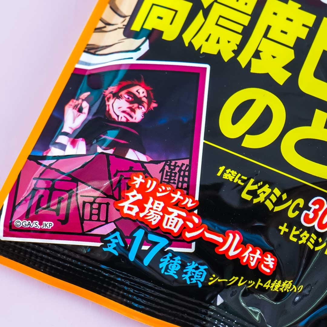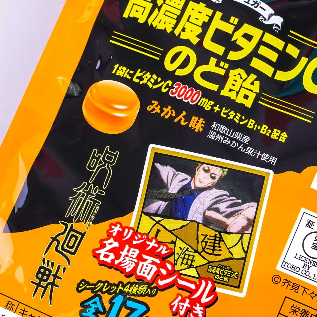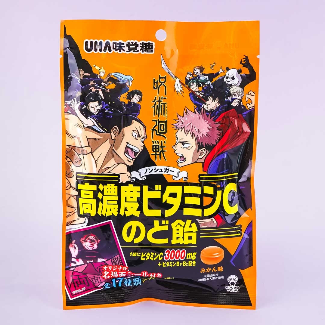This pack of mikan or orange-flavored lozenges features prints of characters from the popular anime, Jujutsu Kaisen! Each candy has a high concentration of vitamin C that helps soothe your throat and prevent colds. You can get four Jujutsu Kaisen stickers taken from a set of 17 when you open this pack of throat candies!