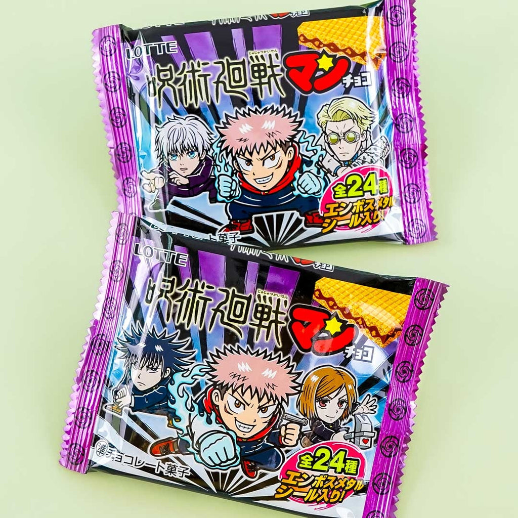 Munch on this yummy wafer snack filled with sweet chocolate! This Bikkuriman series collaborated with the famous action animated series, “Jujutsu Kaisen.” You’ll receive not only a random package design out of two options — but a random character sticker as well out of twenty-four available designs!