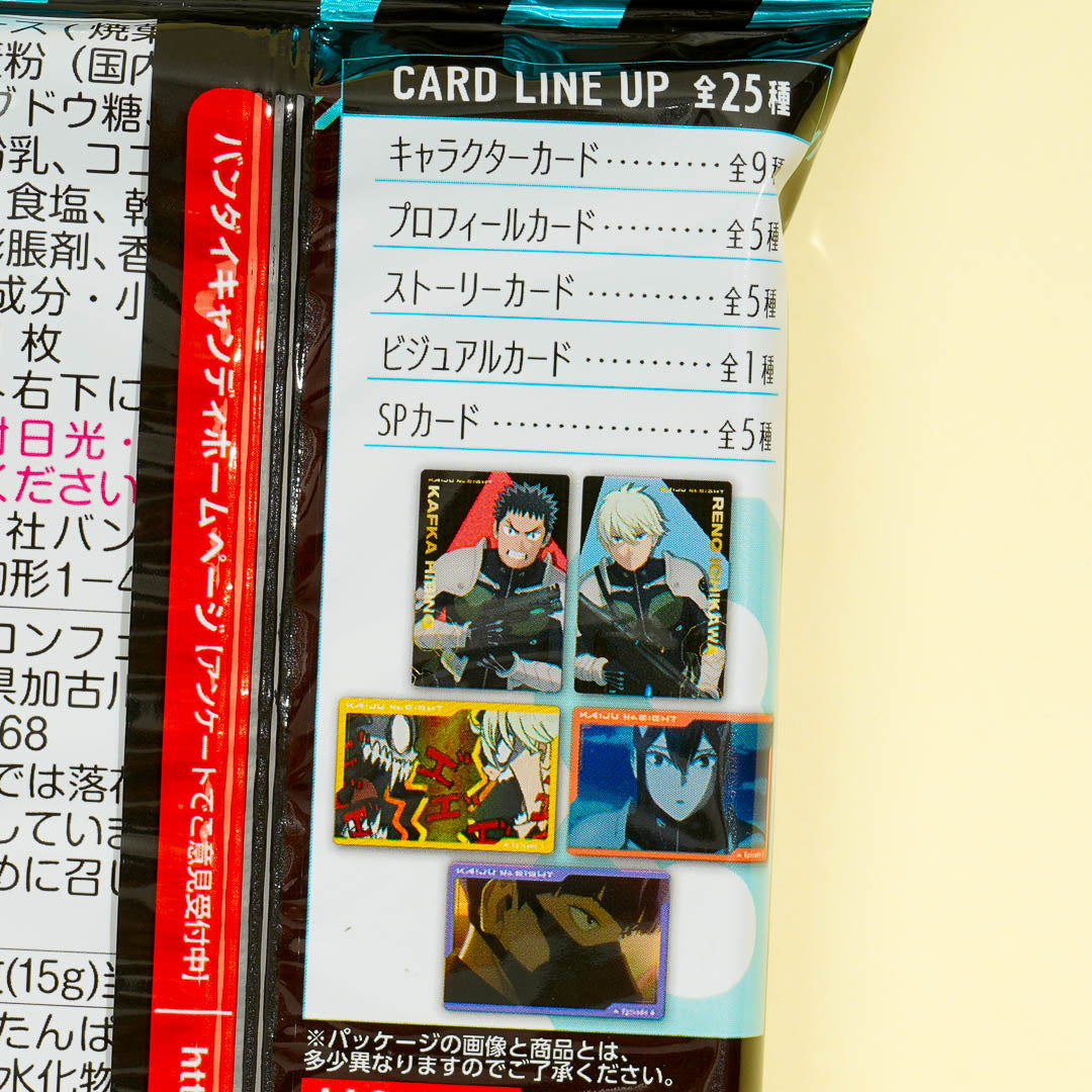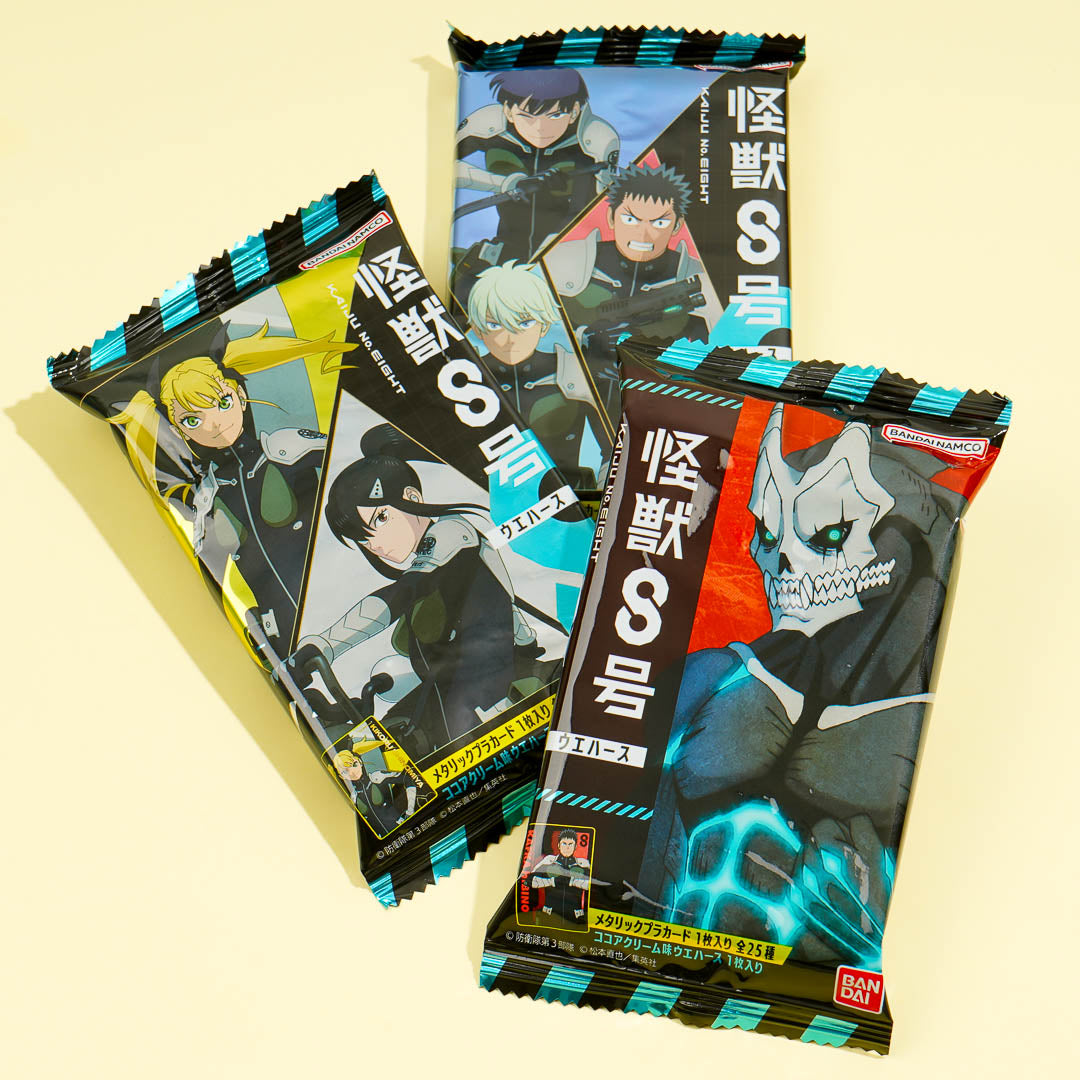 Rewatch your favorite anime series while munching on this wafer pack illustrated with characters from the popular boys' anime, Kaiju No.8! It comes with a collectible card. Surprise yourself with a random card from a set of 25 designs when you order.