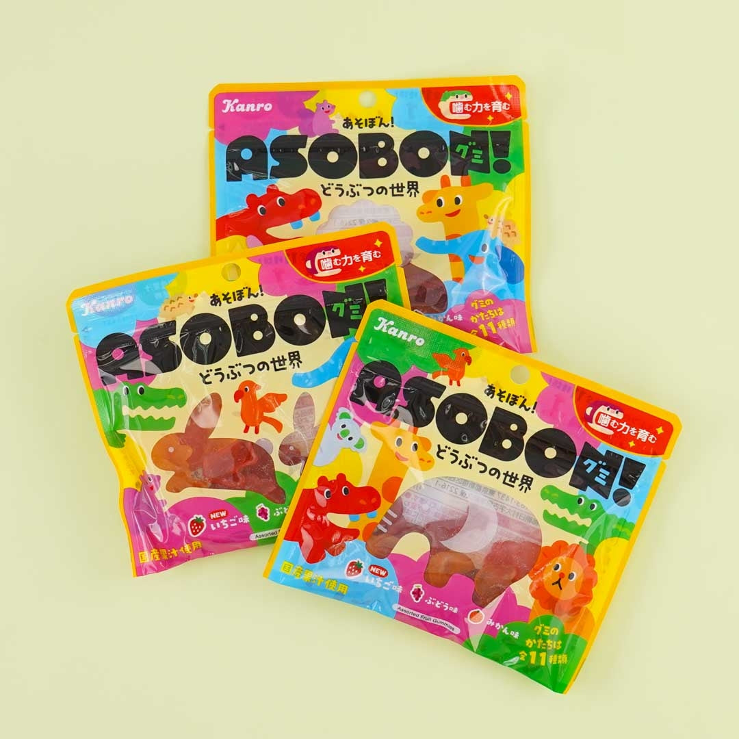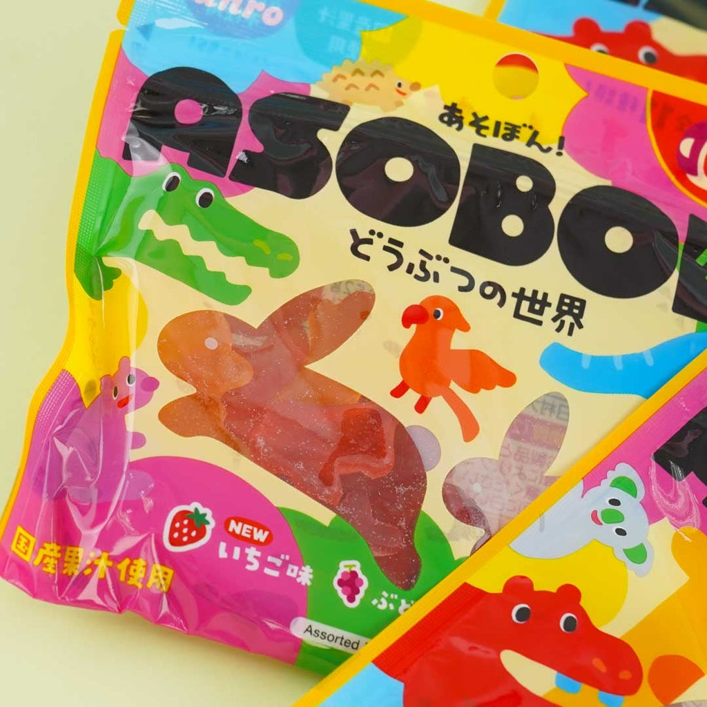 A pack of animal-shaped gummies in orange, strawberry, and grape flavors