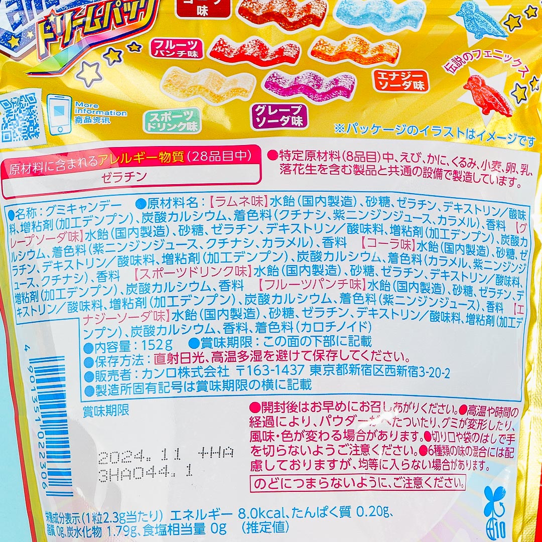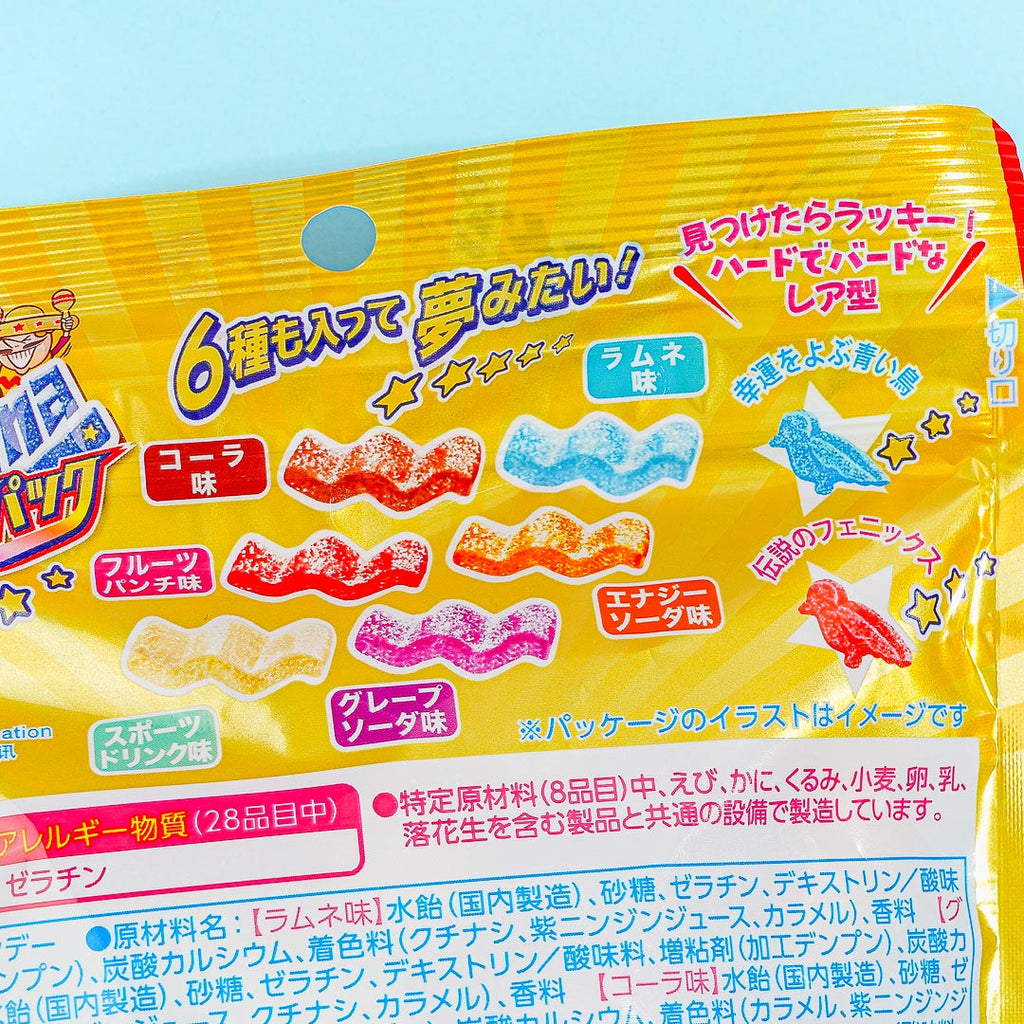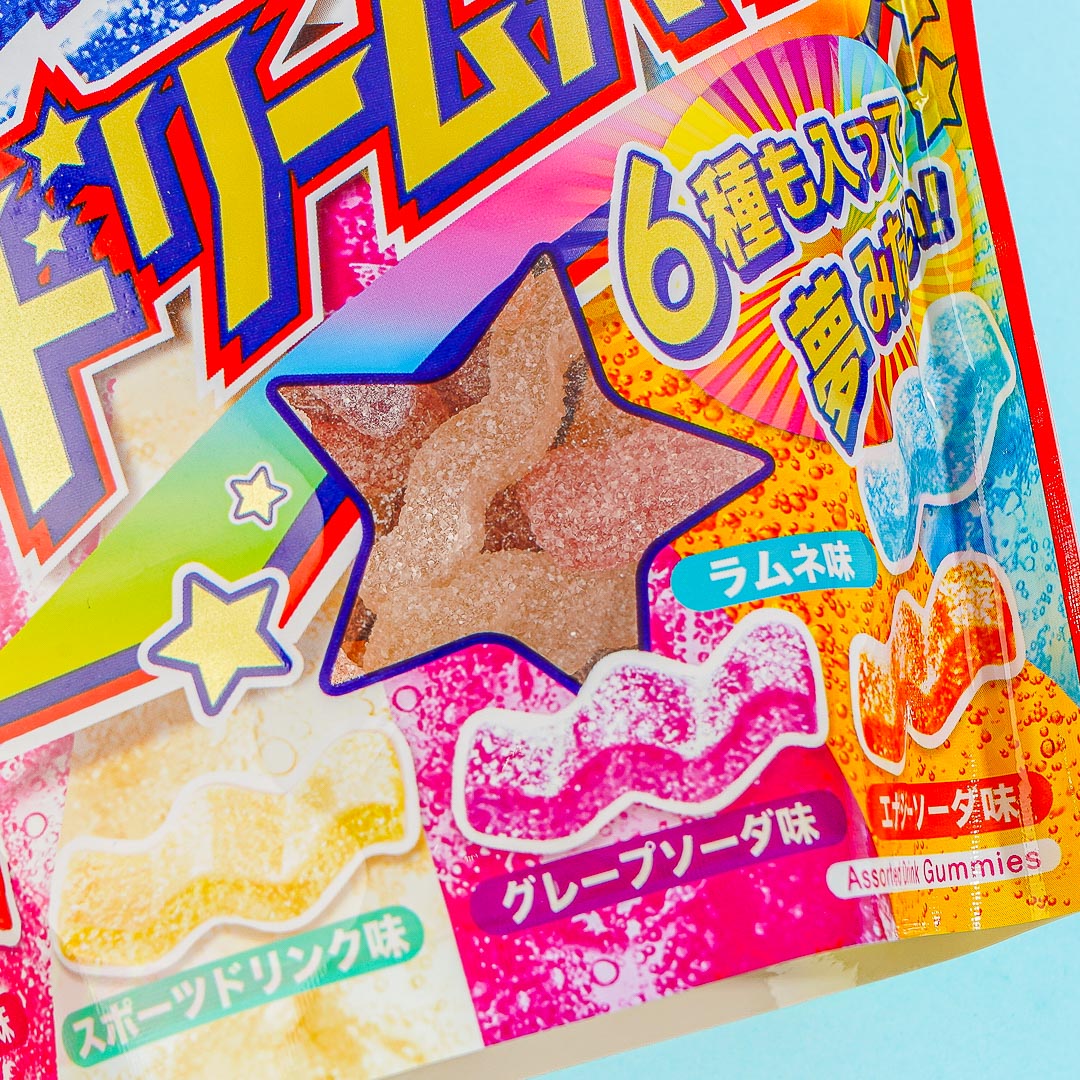 Enjoy chewing on these tasty wave-shaped gummies coated with sour powder. This pack of chewy treats has six different dreamy flavors for you to enjoy - muscat, peach, tangerine, grape soda, ramune, and cola.