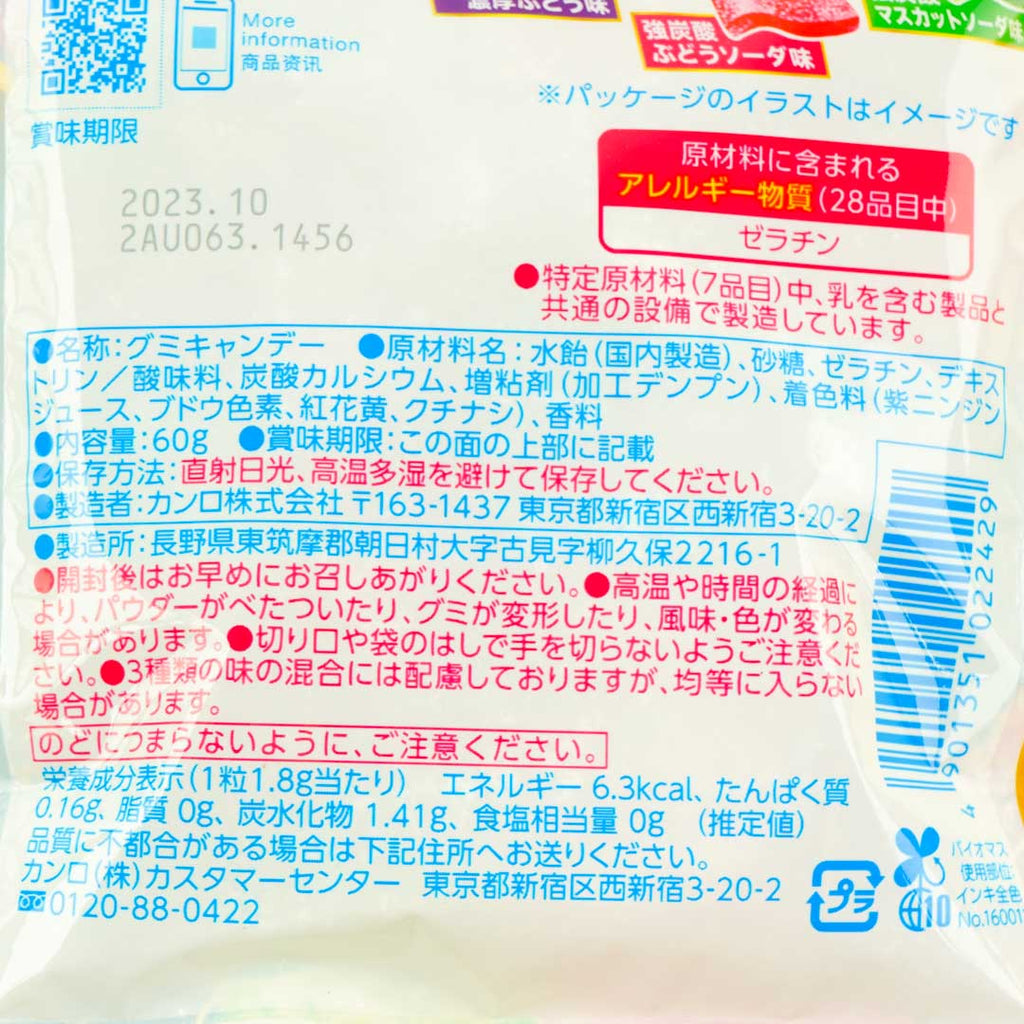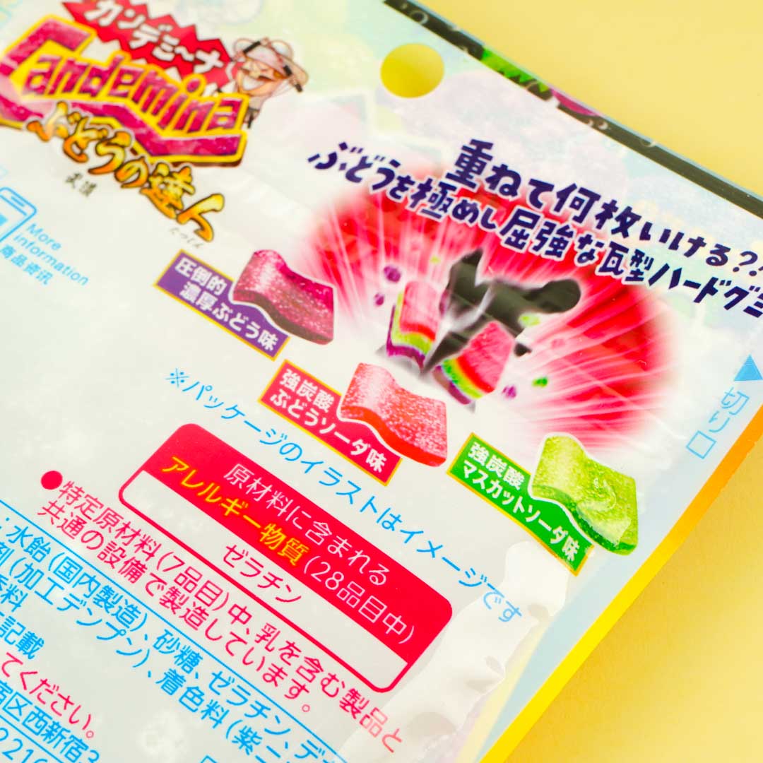 Have fun trying out these yummy wavy gummies! Each piece is generously coated with super sour powder! This bag contains three delicious flavors: grape soda, rich grape, and muscat.