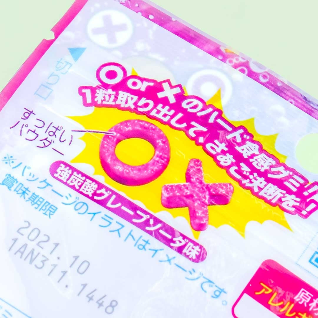 • A resealable pack of o-shaped and x-shaped gummies with a strong soda grape flavor