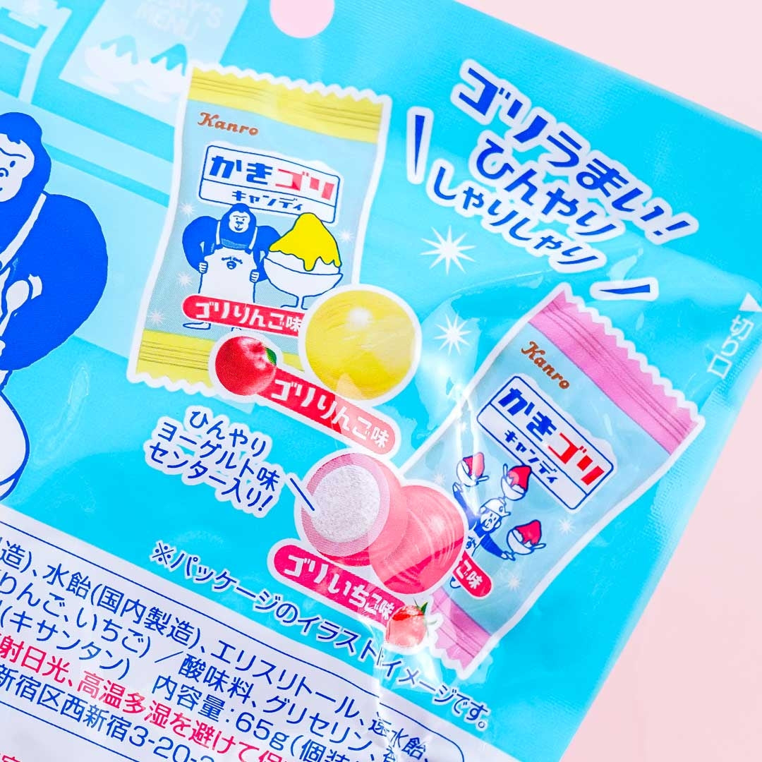 Enjoy this kakigori or Japanese shaved iced-flavored treats that are not only delicious but come with a fun story as well! Happy goris or gorillas created these ball candies that taste like “gorilla apple shaved ice” and “gorilla strawberry shaved ice.” Each piece has a cool yogurt-flavored center and comes individually wrapped!