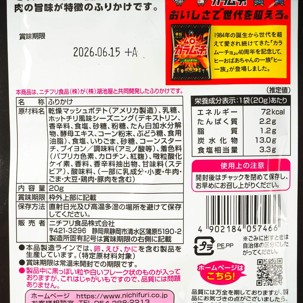 This pack of furikake seasoning is the perfect topping for your rice, onigiri rice balls, and bento boxes. It's inspired by Koikeya's popular potato chip brand, Karamuccho. Enjoy the hot chili flavor of this furikake!