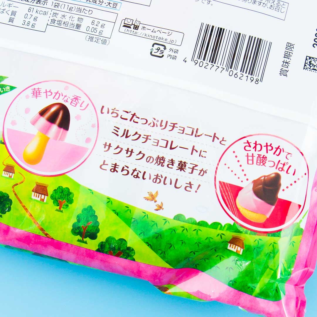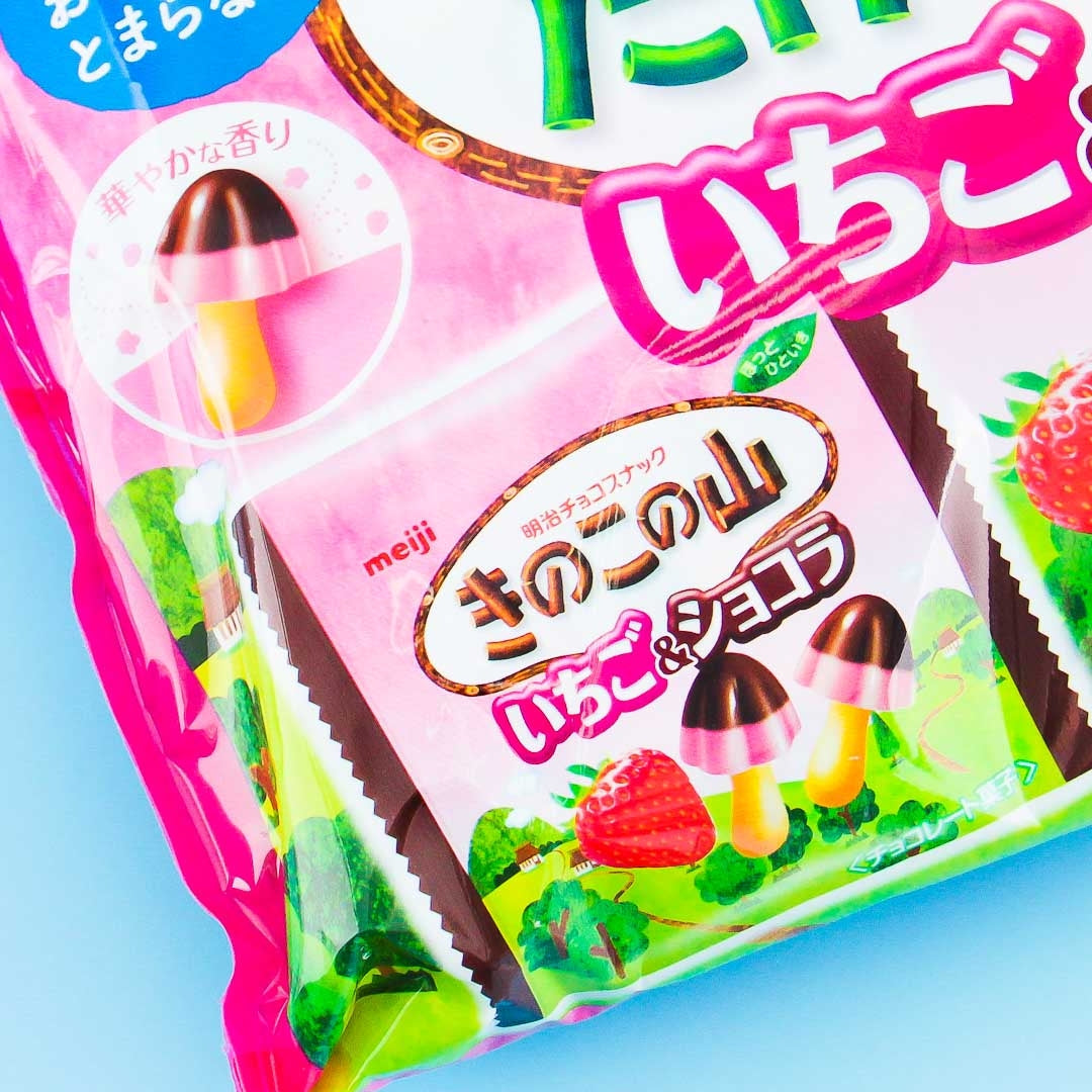 • A set of strawberry chocolate-flavored biscuits shaped like mushrooms and bamboo shoots