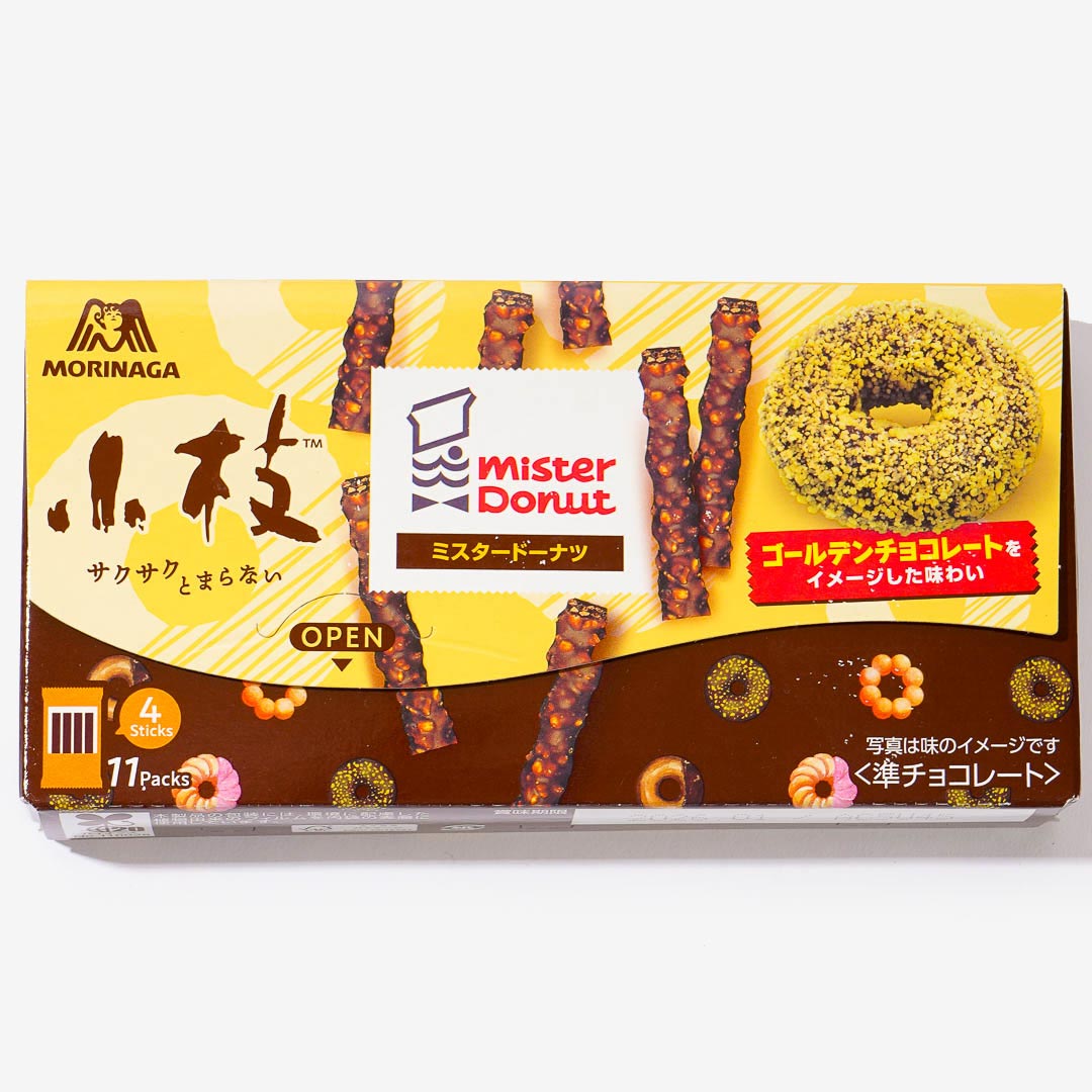 This box of stick-shaped chocolates comes from a collaboration between Mister Donut and Koeda. It's inspired by Mister Donut's golden chocolate donuts. Enjoy the combination of cocoa-flavored chocolate, puffs, and donut-flavored chocolate chips with every bite!
