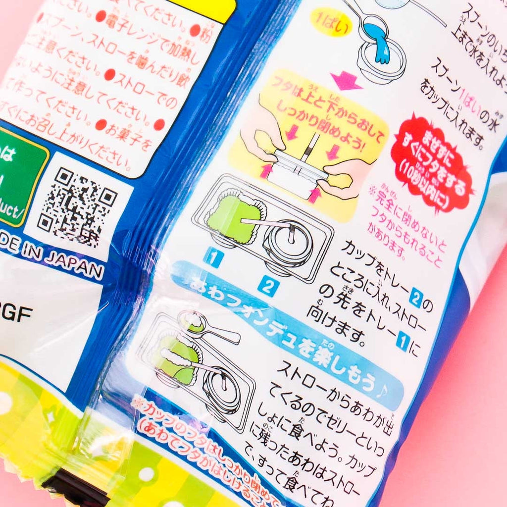 Kids and adults will enjoy this fun and flavorful DIY candy kit! First, add water to the jelly powder to make your own refreshing melon soda-flavored jelly. Then mix the foam powder with water, seal it with the straw lid, and watch as scrumptious soda bubbles ooze from the straw! Eat these two concoctions together to discover a totally new candy taste!