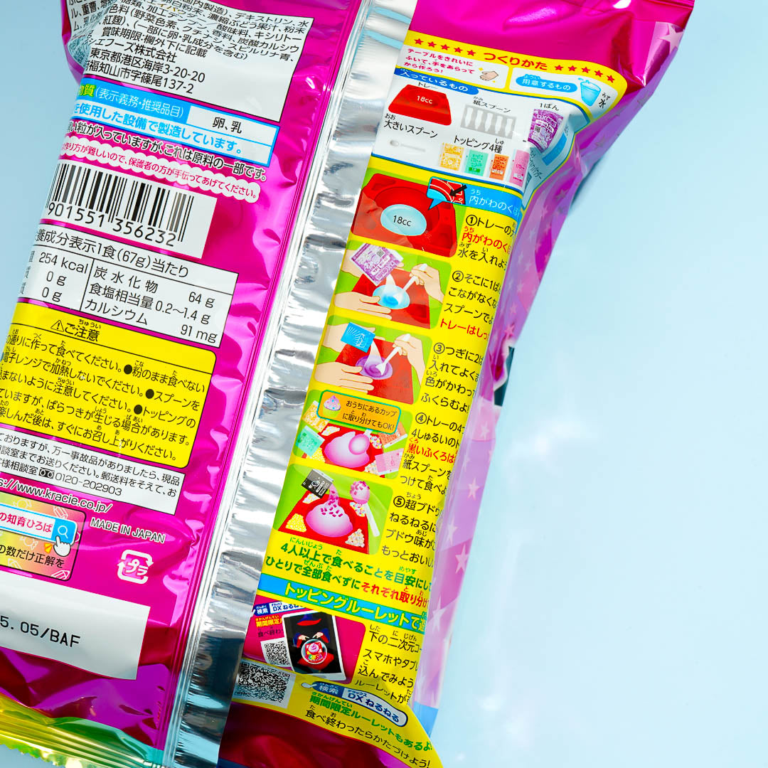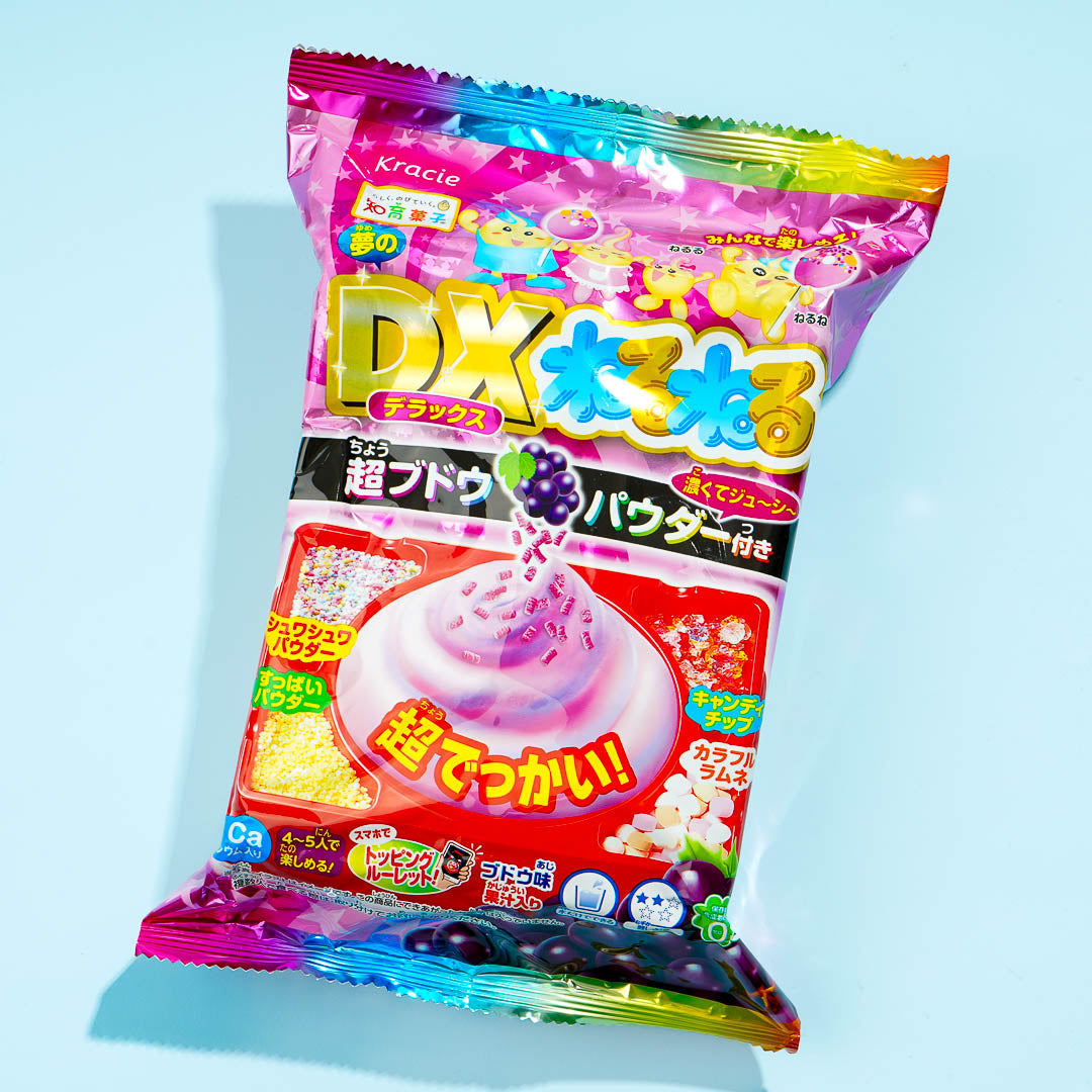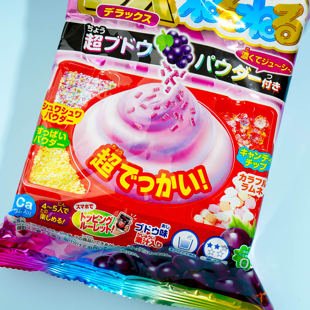 Have fun creating your own Nerunerunerune grape-flavored candy at home with this bigger-sized DIY kit. Simply add the powder mixes into the plastic mold with water, stir, and watch them turn into a fluffy yummy treat! Enjoy adding the four different toppings. This kit contains calcium but has no artificial preservatives or color additives so it is 100% safe for children.