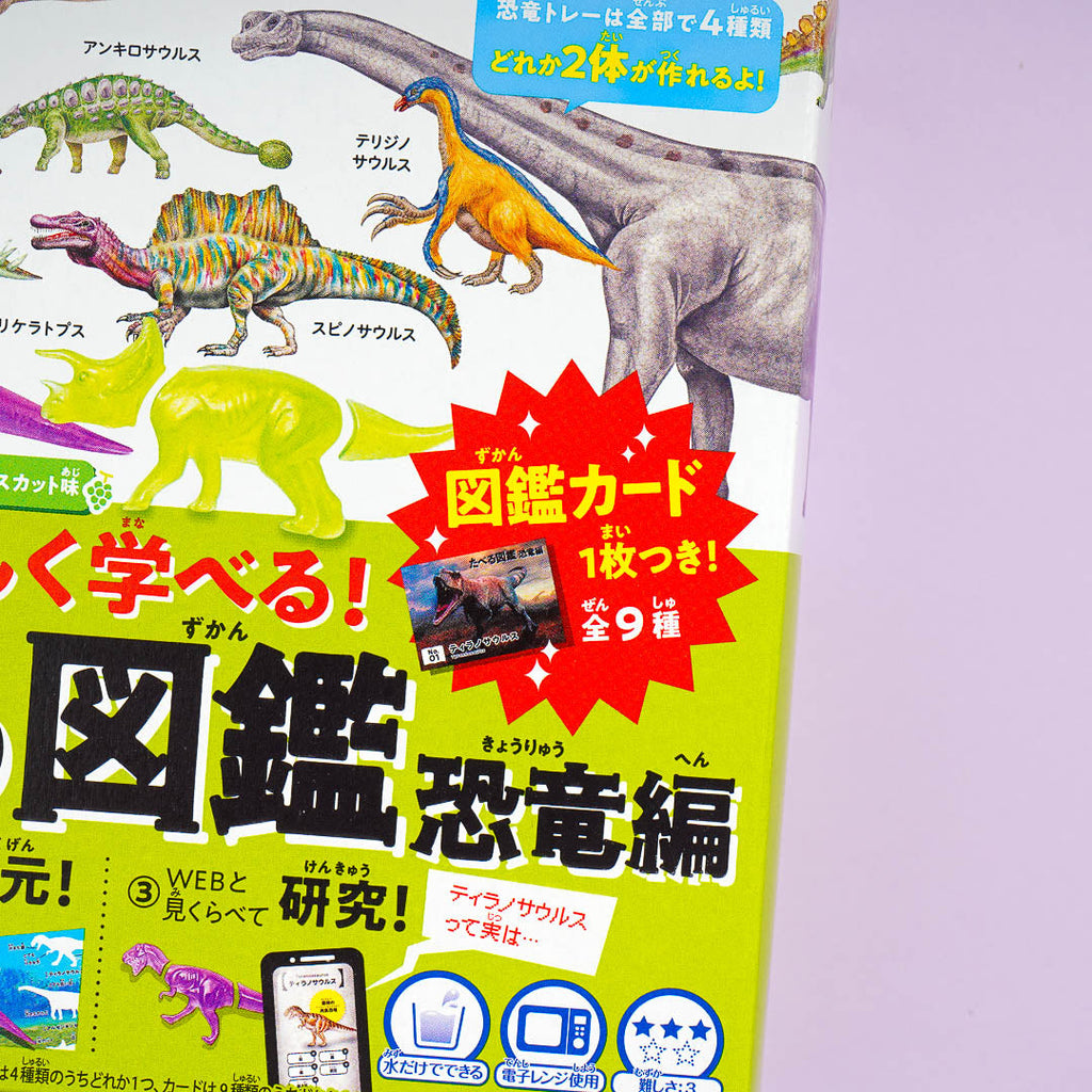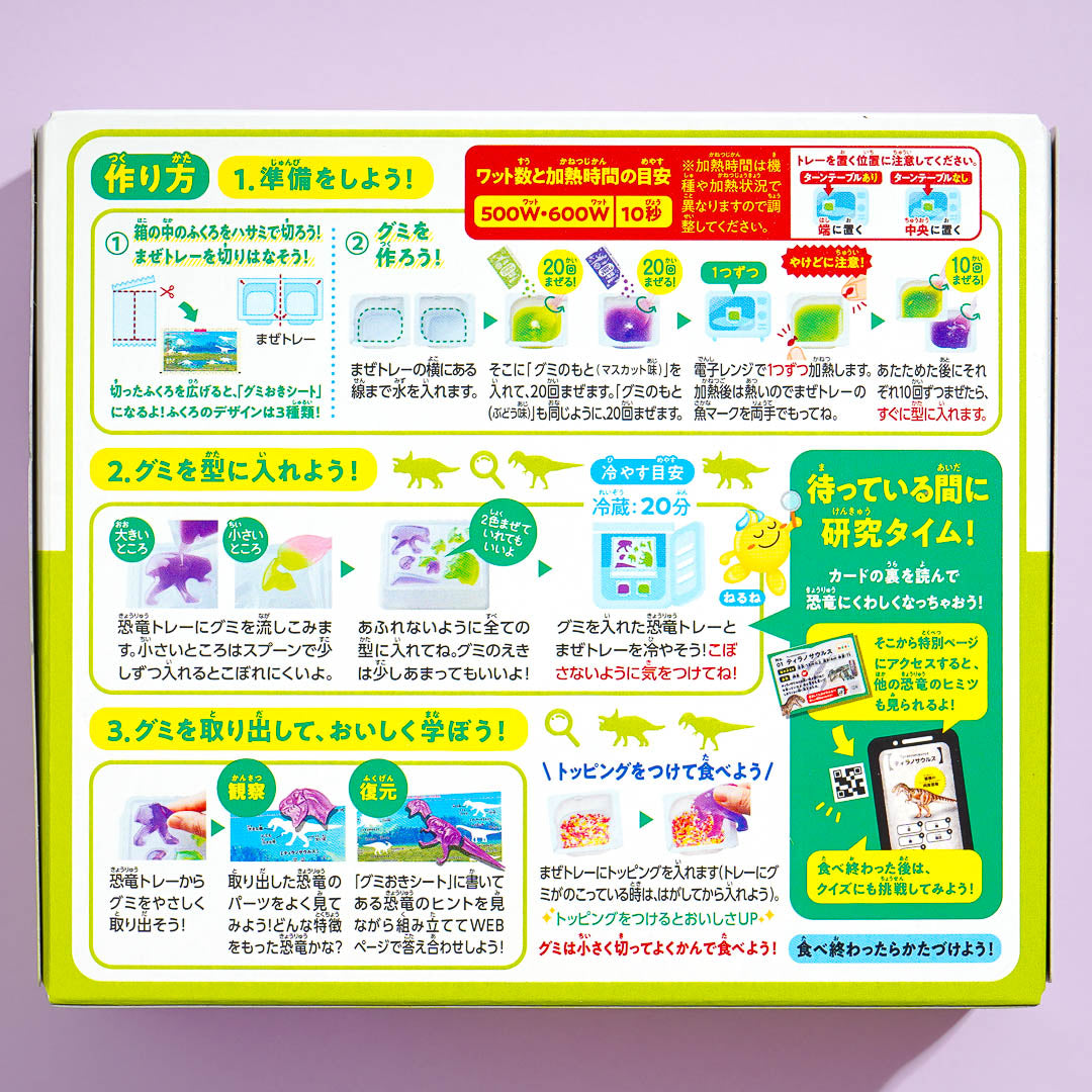 Just follow the instructions in the back to make the gummies. It comes with a book card randomly selected from a set of 9 different designs. Find the QR code to access the product web page and learn more about dinosaurs!