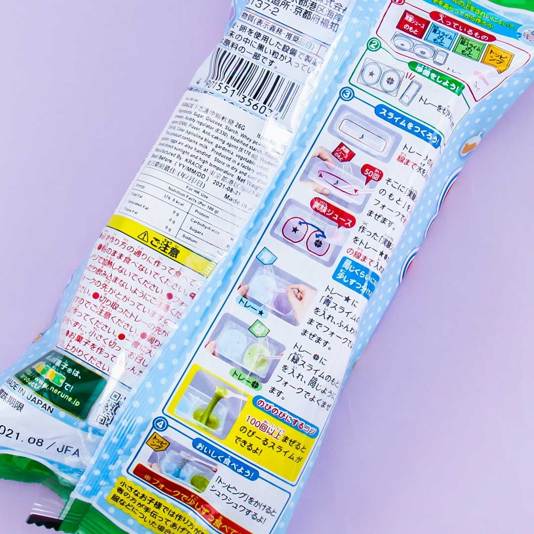 First of all this candy is so, so easy to use! It has the most simple instructions but you can play with it for a long time before being unable to resist eating! It does have a mucus-like texture, but it’s more like foam slime if you’ve ever played with that. The muscat flavor is delicious and the soda flavor tastes just like ramune. When you mix them together it tastes like sprite! It’s a good price and arrived timely, I would definitely recommend it for a fun DIY candy.