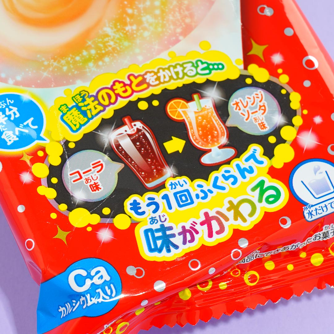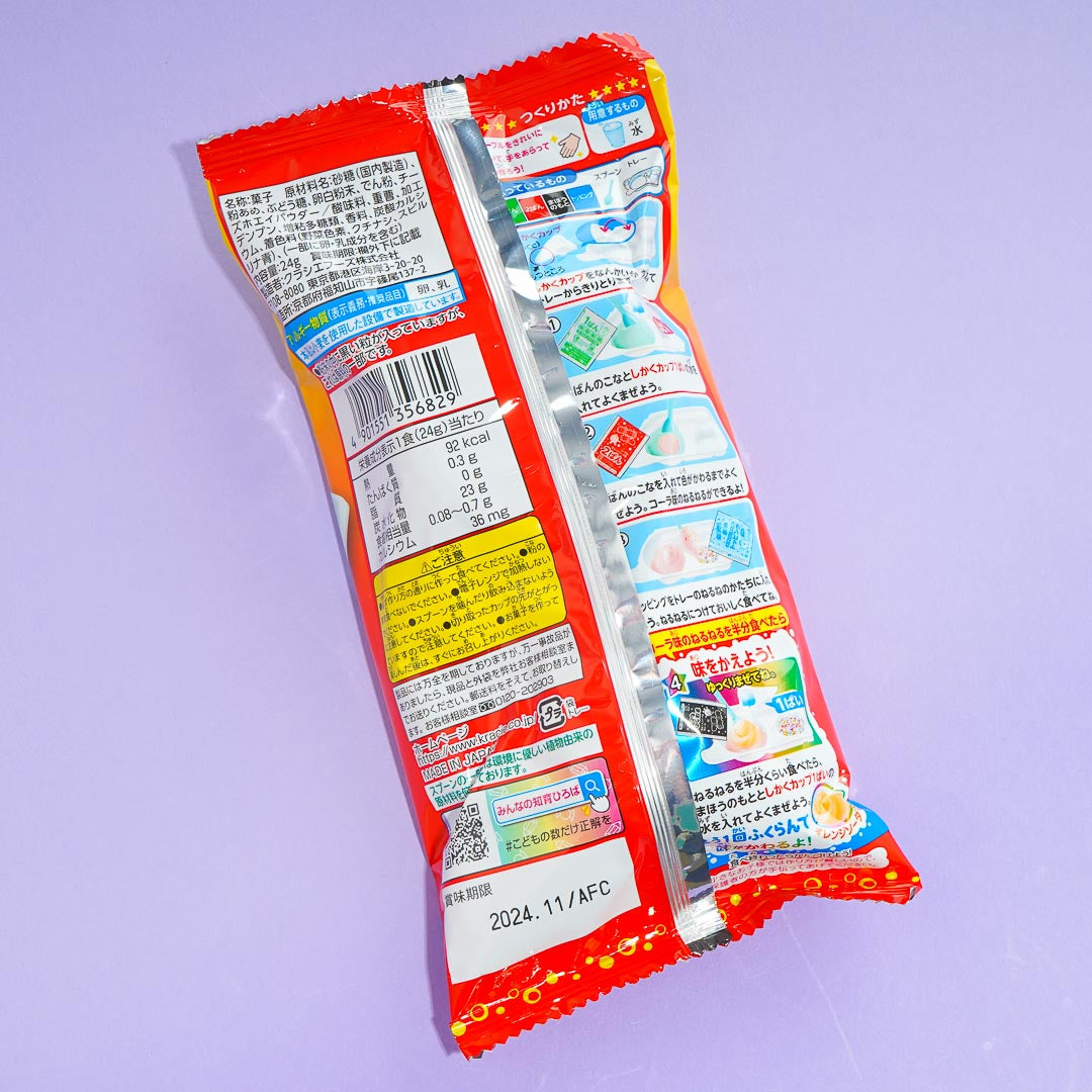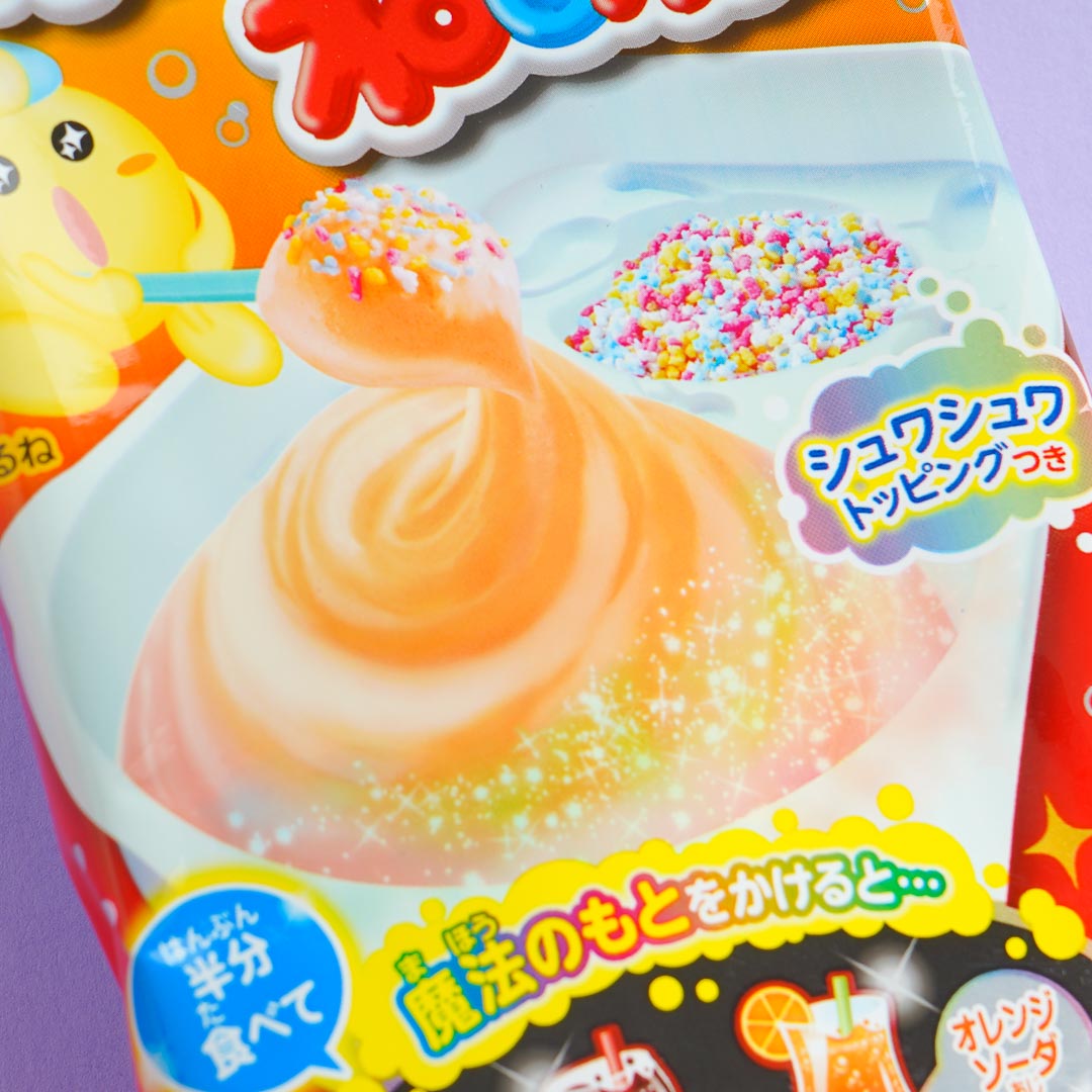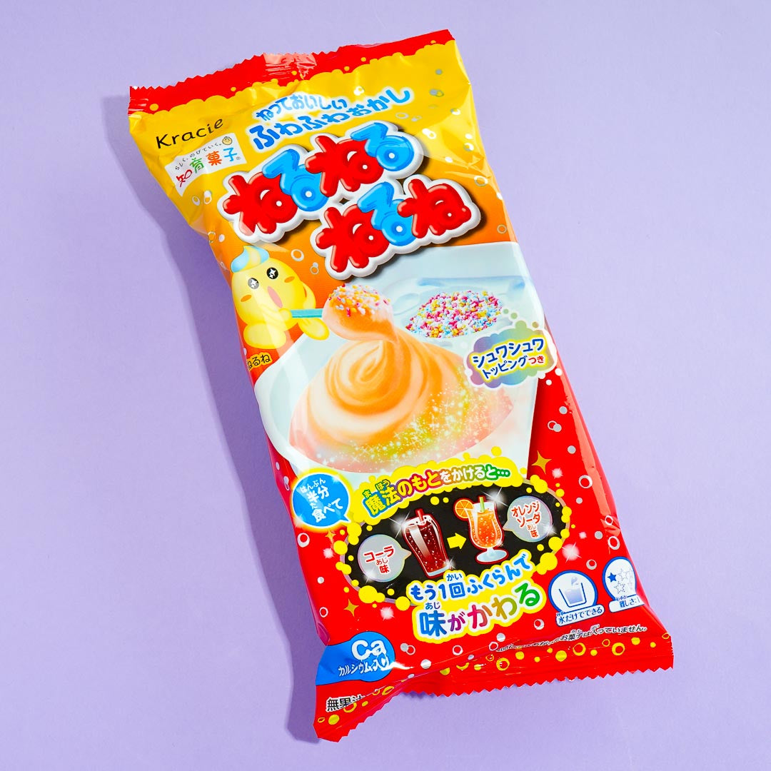 Have a blast and enjoy the sweet taste of this do-it-yourself Nerunerunerune soda candy. The flavor is a mixture of cola and orange soda and comes with fizzy toppings. Just add water and have a fun fluffy treat!