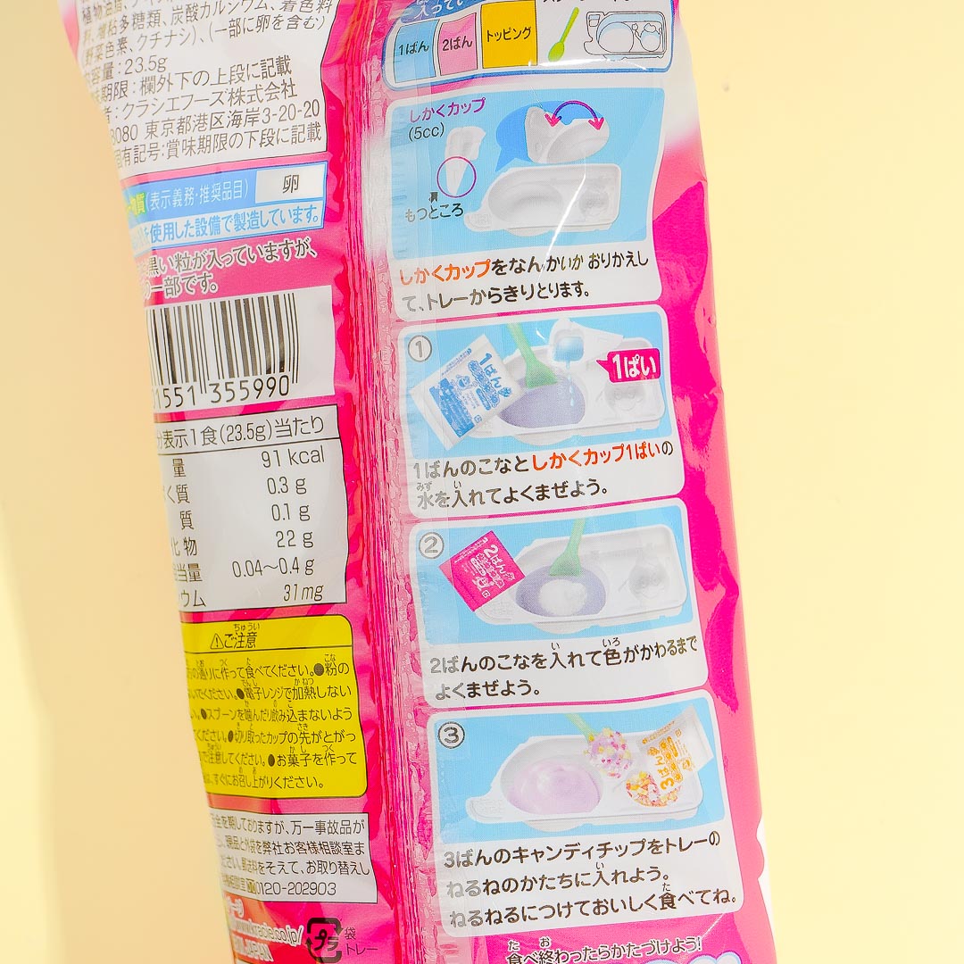 Package includes: 2 x bags of powder with different ingredients, 1 bag of ramune toppings, x 1 x spoon & 1 x mold