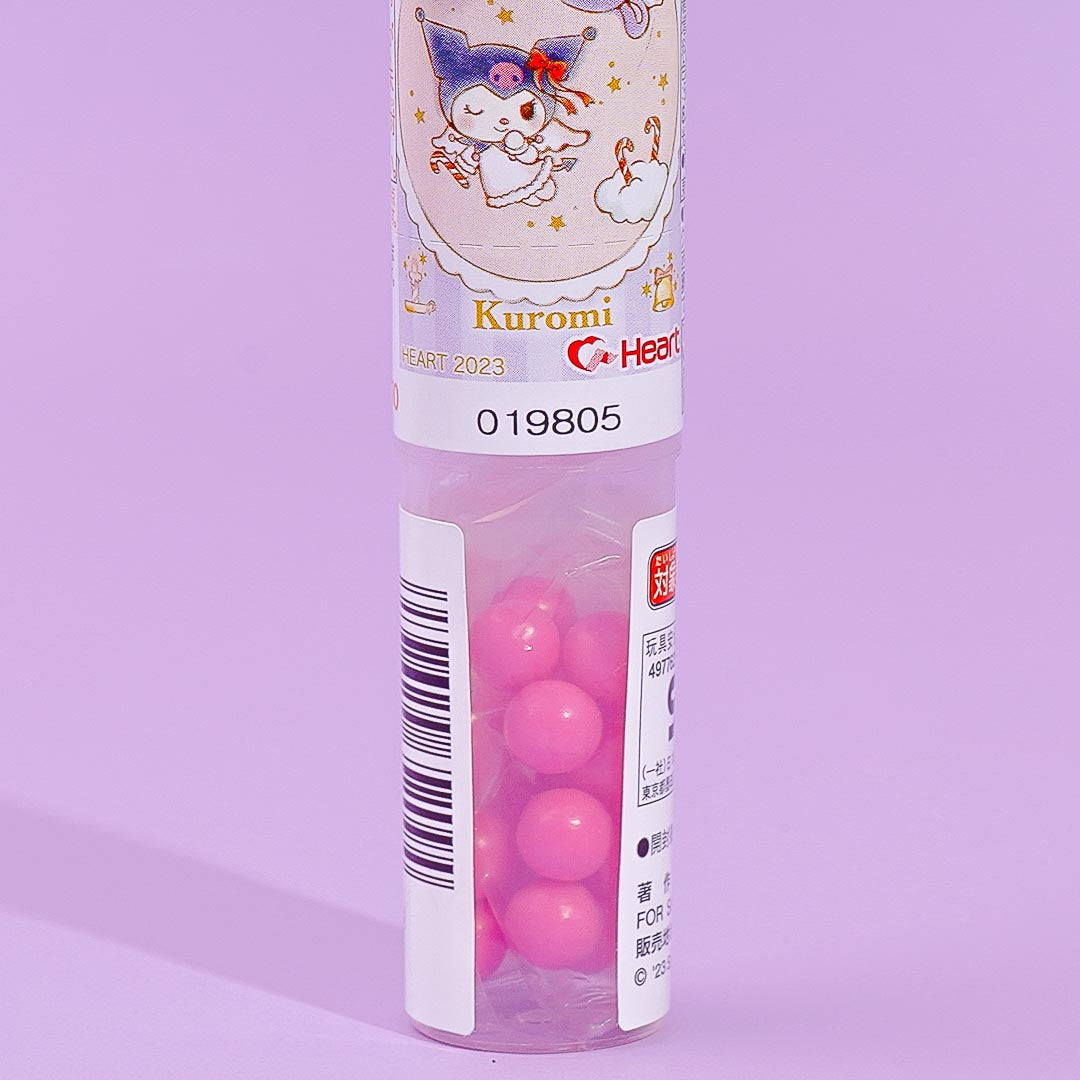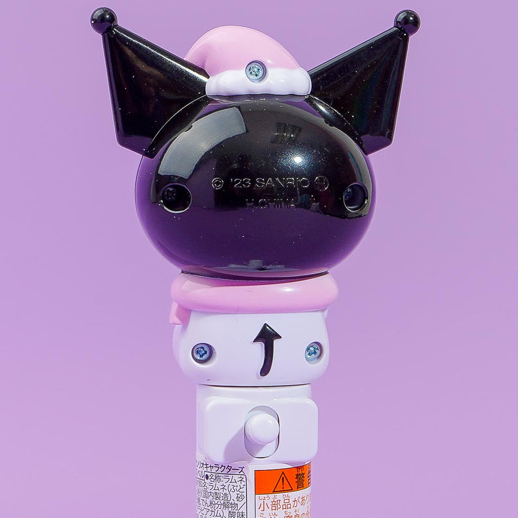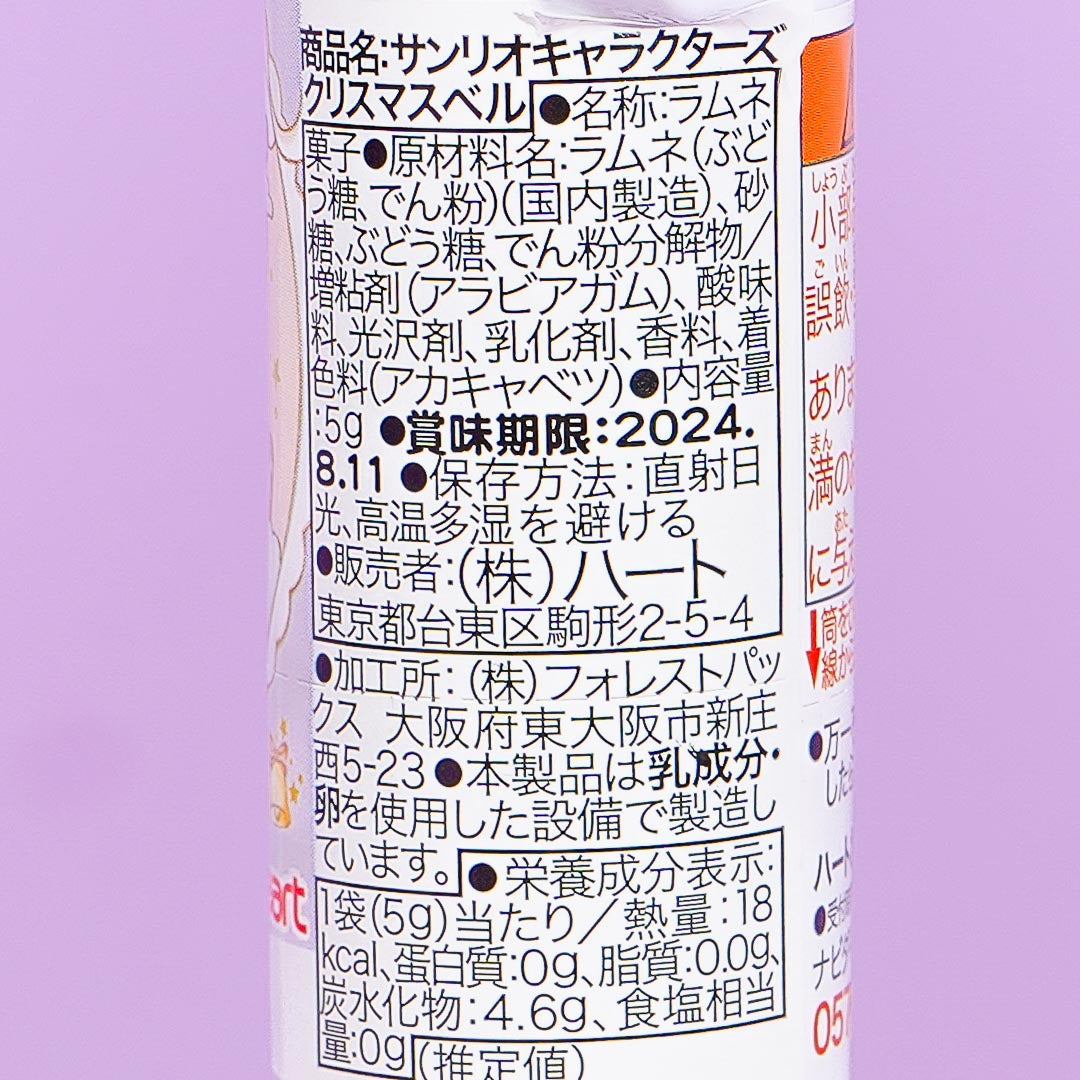 Ramune is a popular Japanese carbonated soft drink. Enjoy the taste of ramune when you eat these yummy candy balls! They come in a container with Kuromi sitting happily on top all dressed for the holidays. Every time you pull the lever to get some candy, Kuromi rings the bell for Christmas!