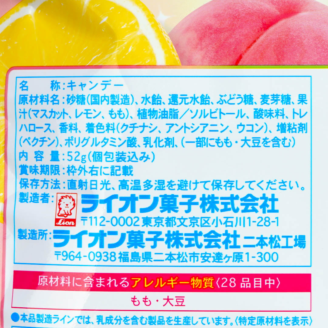 Give in to your sweet tooth and indulge in this pack of fruit candies. Each piece has a center filled with delectable fruit juice! There are three different flavors for you to enjoy - lemon, peach, and muscat.