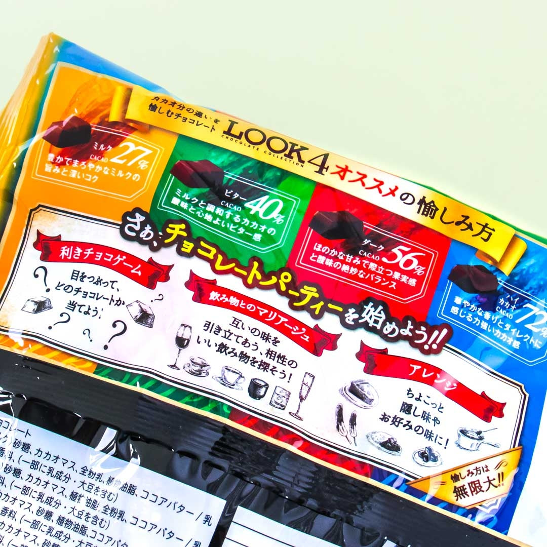Learn to taste the differences in cacao percentage with this bag of premium Japanese chocolate! The chocolates have four levels of cacao concentration with milk (27%), bitter (40%), dark (65%), and high cacao (70%). Share the experience with your friends and family!