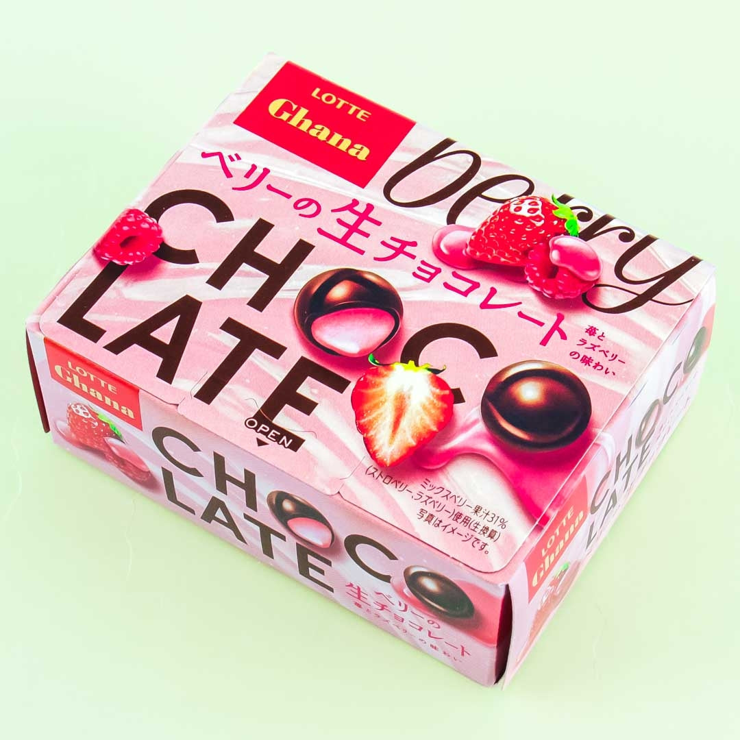 A box of individually wrapped melty strawberry and raspberry chocolate coated in Ghana milk chocolate