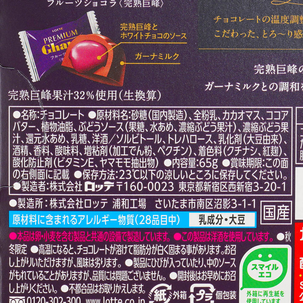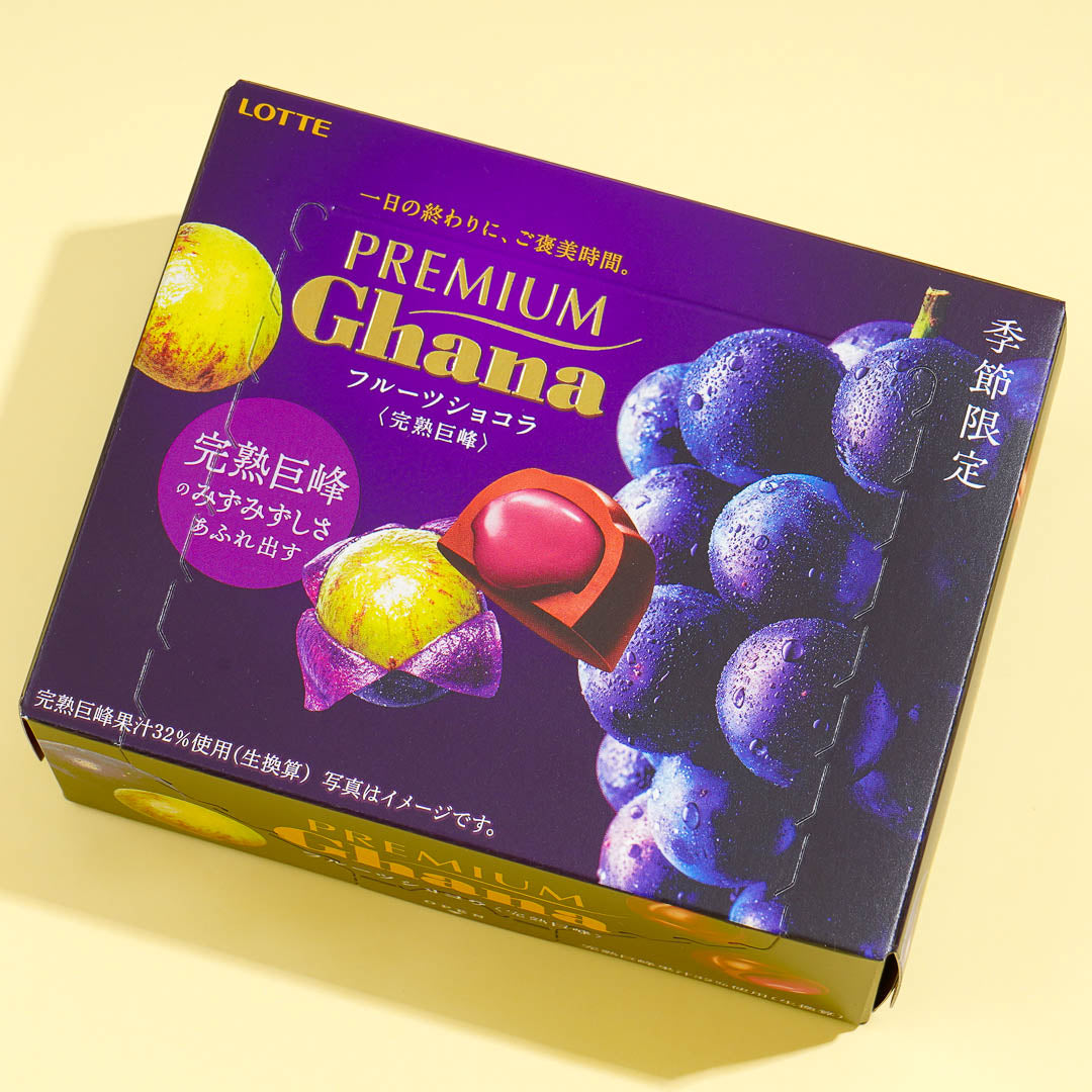 This premium chocolate offers a perfect balance of refreshing fruitiness and creamy milk sweetness! Each Ghana chocolate has a creamy center made with white chocolate and Kyoho grapes. This filling was carefully heated to create a smooth melted texture. Indulge in this high-quality treat after a hearty meal!