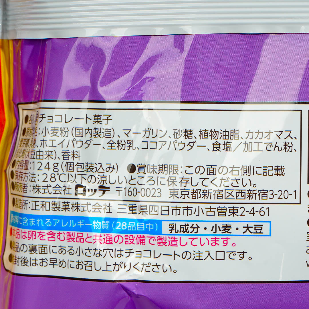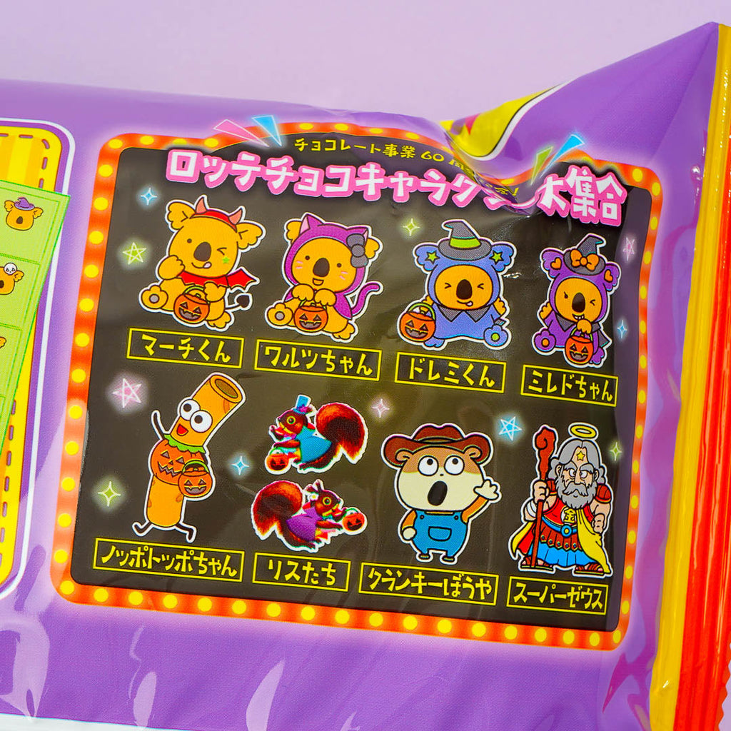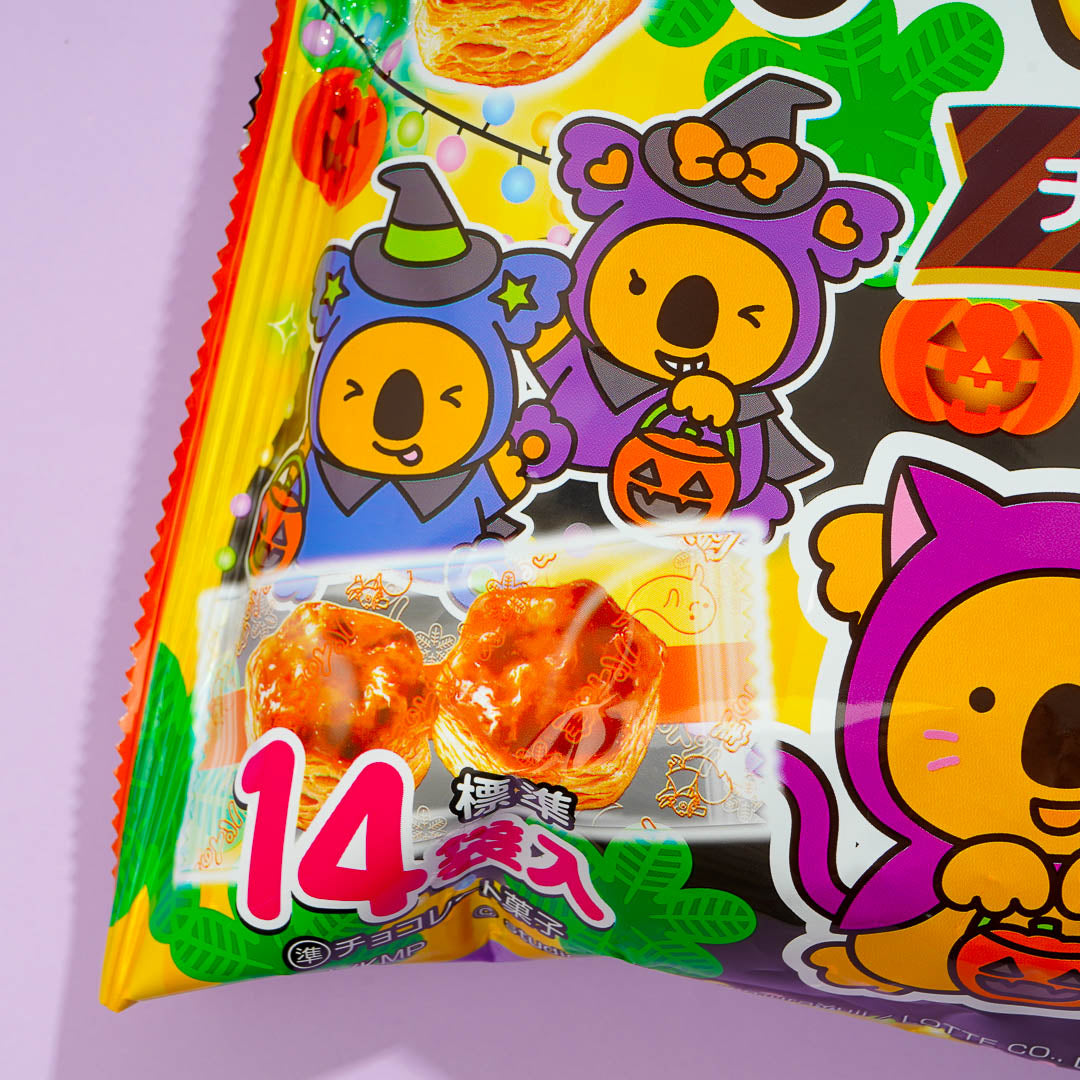 A big pack of chocolate-filled pie pastries showcasing prints of Lotte characters dressed up for Halloween