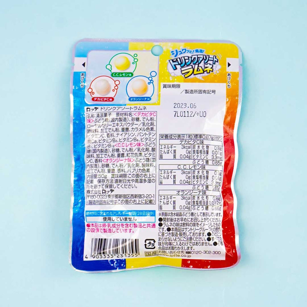 Get instantly refreshed with this pack of ramune candies that have unique drink flavors! Collaborating with the Japanese beverage company Suntory, this bag of candy balls tastes like popular Suntory drinks like Dekavita C energy drink, C.C. Lemon drink, and Orangina fruit drink. Take these candies anywhere as they come in a convenient resealable bag!