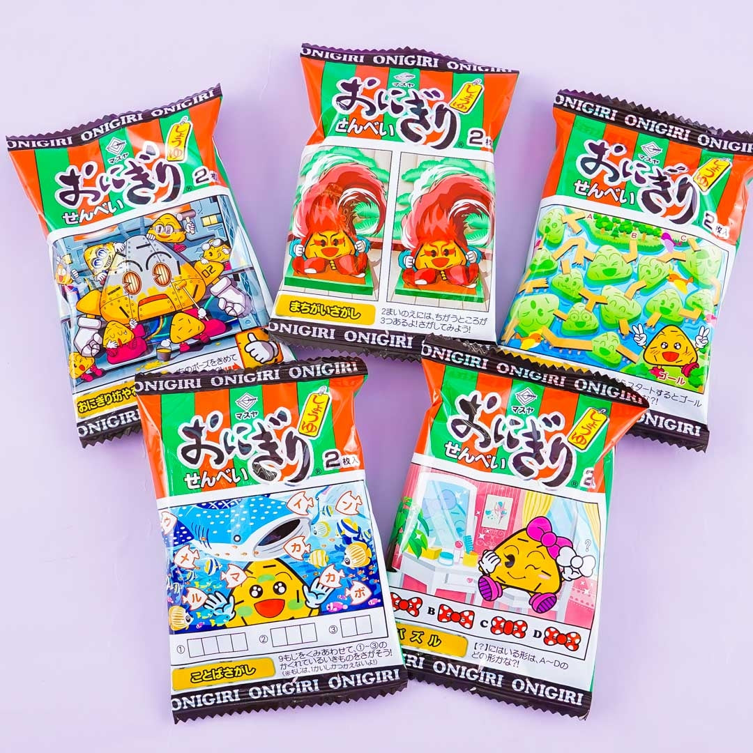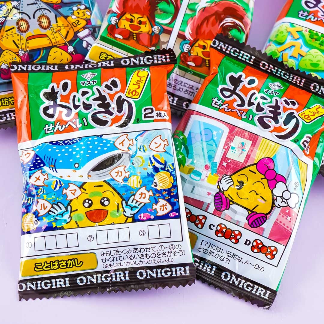 Enjoy snacking on this pack of senbei or Japanese crackers shaped like onigiri or Japanese rice balls. Each piece is seasoned with grilled seaweed and aged soy sauce. The packaging has mini-games that you can play. Surprise yourself with a random package design when you order.