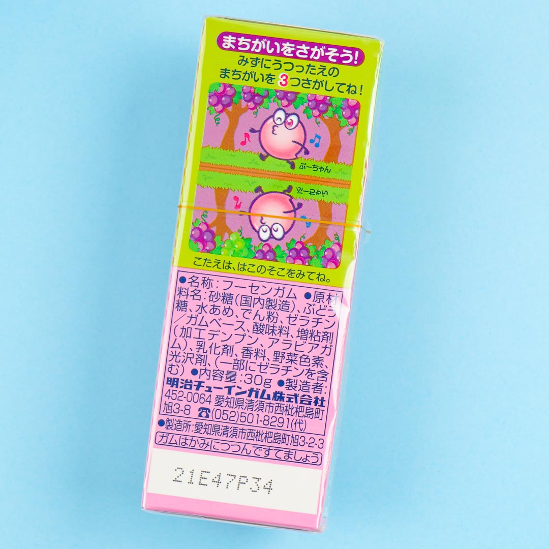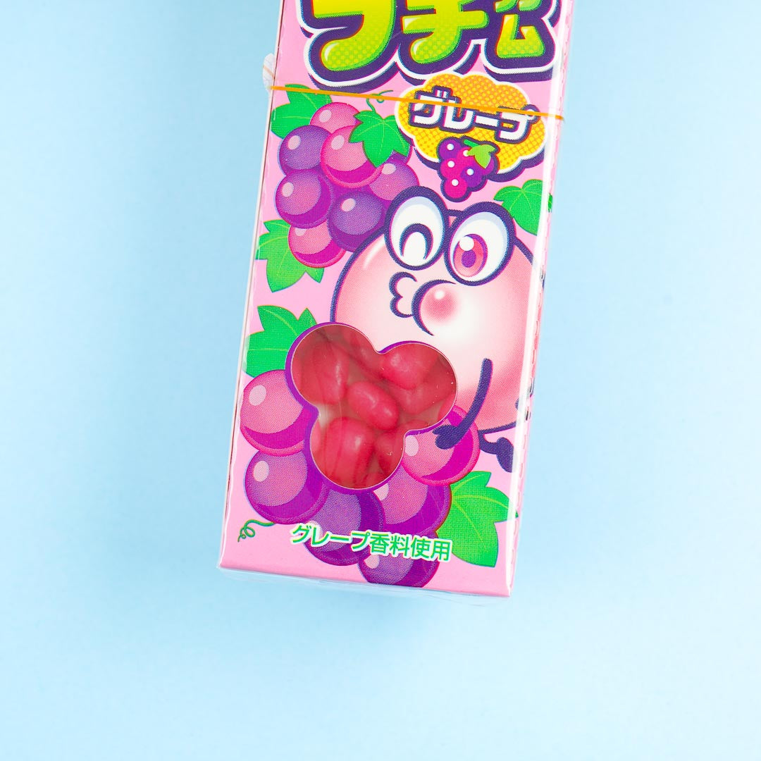 Take this treat with you wherever you go! It's a box of bubble gum pellets that are jam-packed with juicy grape flavor. The box has a side opening and is easy to carry around.
