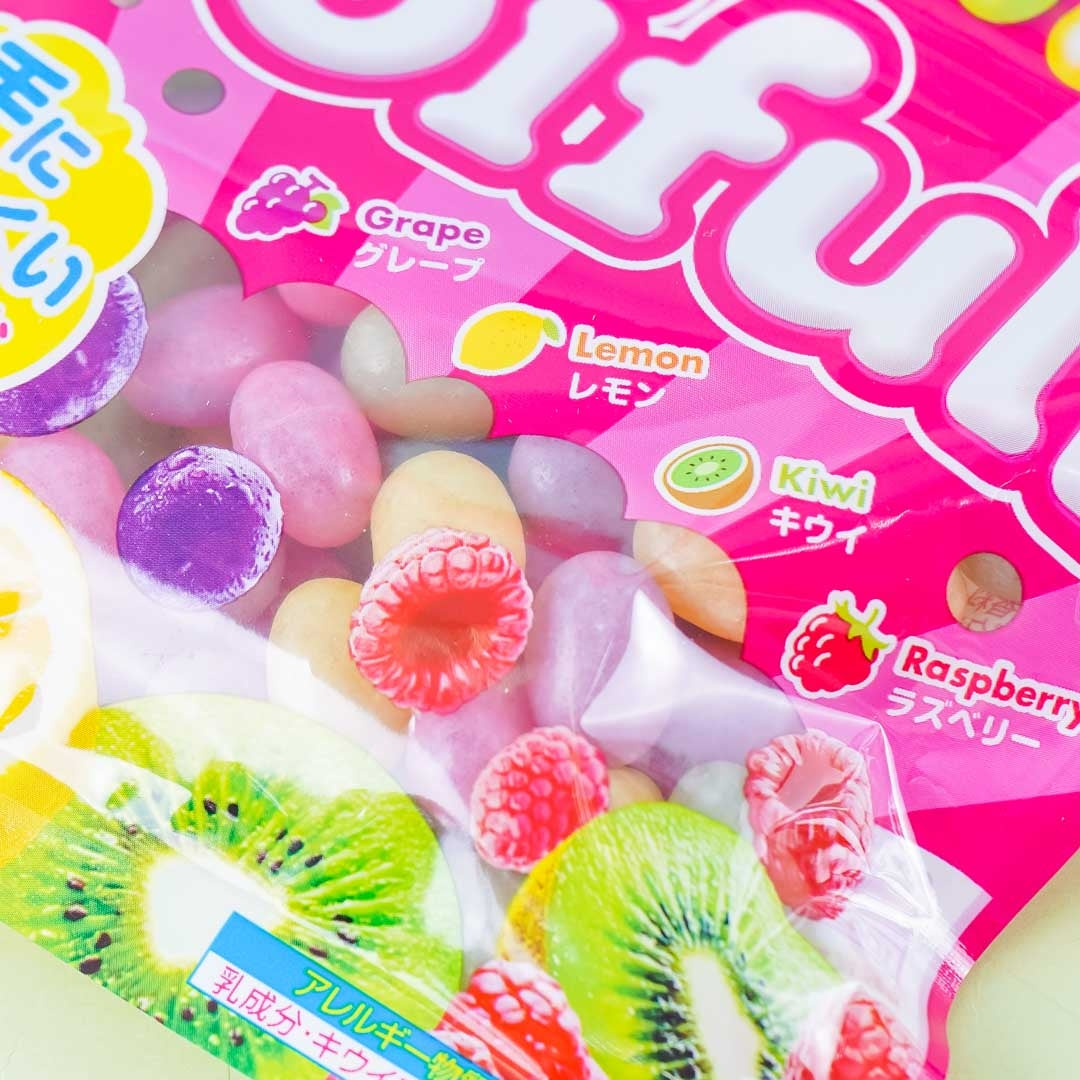 A resealable pack of gummy candies with grape, lemon, kiwi, and raspberry flavors