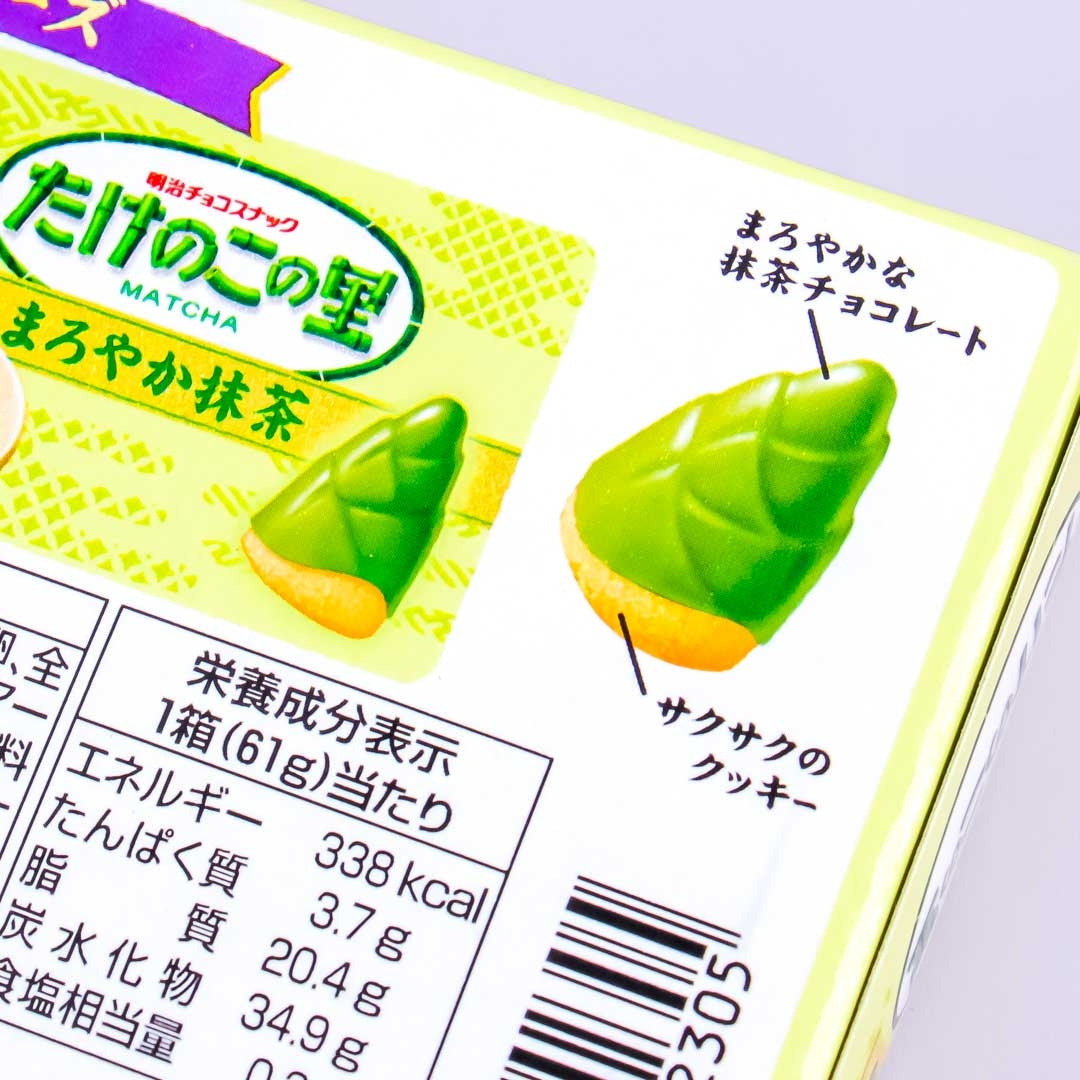 Enjoy these sweet and crunchy biscuits shaped like takenoko no sato or bamboo shoots of the village! These tasty snacks are covered in premium chocolate mixed with Maroyaka matcha.