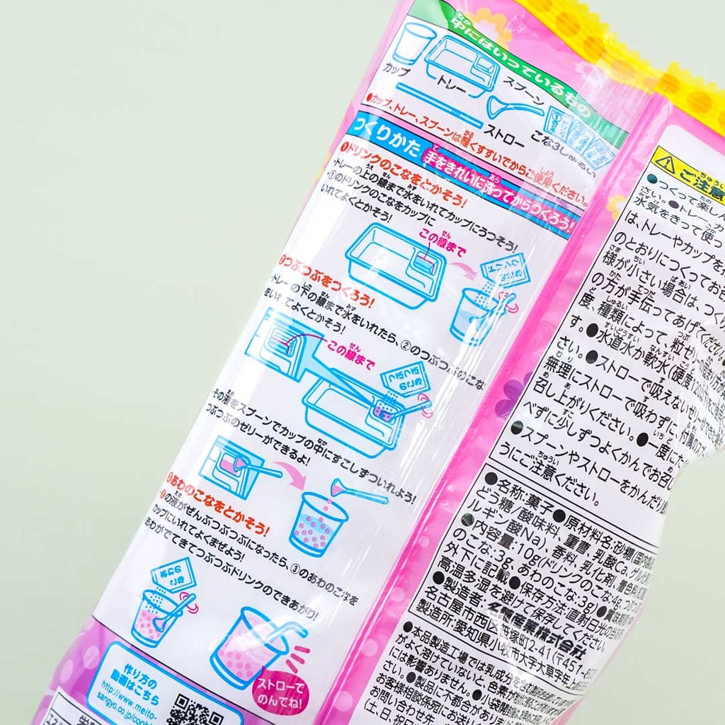 Enjoy creating your own grape-flavored soda with tapioca-style jelly using this DIY kit! It comes with three powder packets, a plastic measuring tray, a mini plastic cup, a small spoon, and a straw. Simply dissolve powder number one to create the base grape drink. Stir powder number two with water as well on the provided measuring tray and use the spoon to drop this mixture on the grape soda. Have fun as you see tapioca pearl-shaped jellies form. Before drinking, don’t forget to add the last powder sachet to make this beverage look foamier!