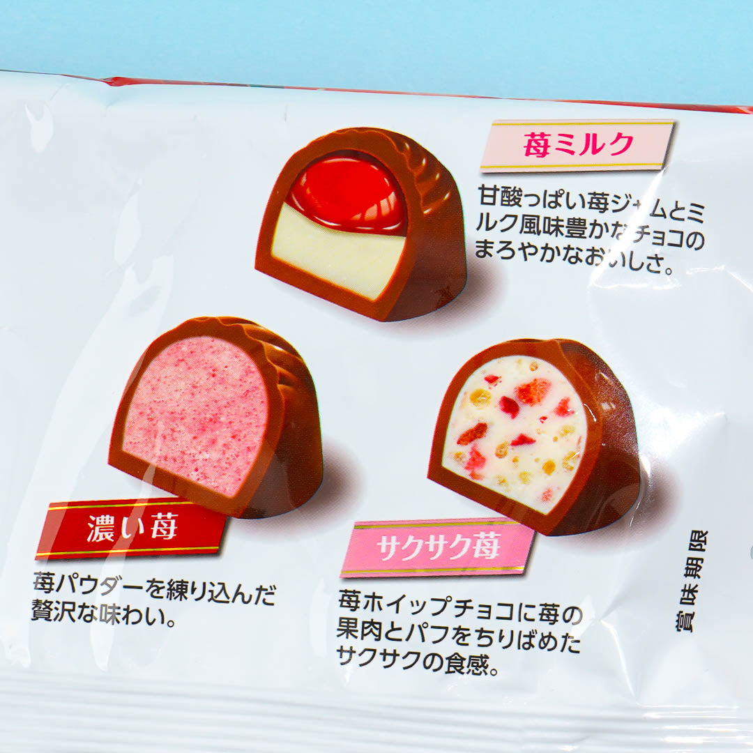 Indulge in this pack of strawberry-filled chocolate treats! It has 3 different types of chocolate for you to enjoy - strawberry milk, dark strawberry, and crispy strawberry. Pair these chocolates with your favorite cup of coffee!