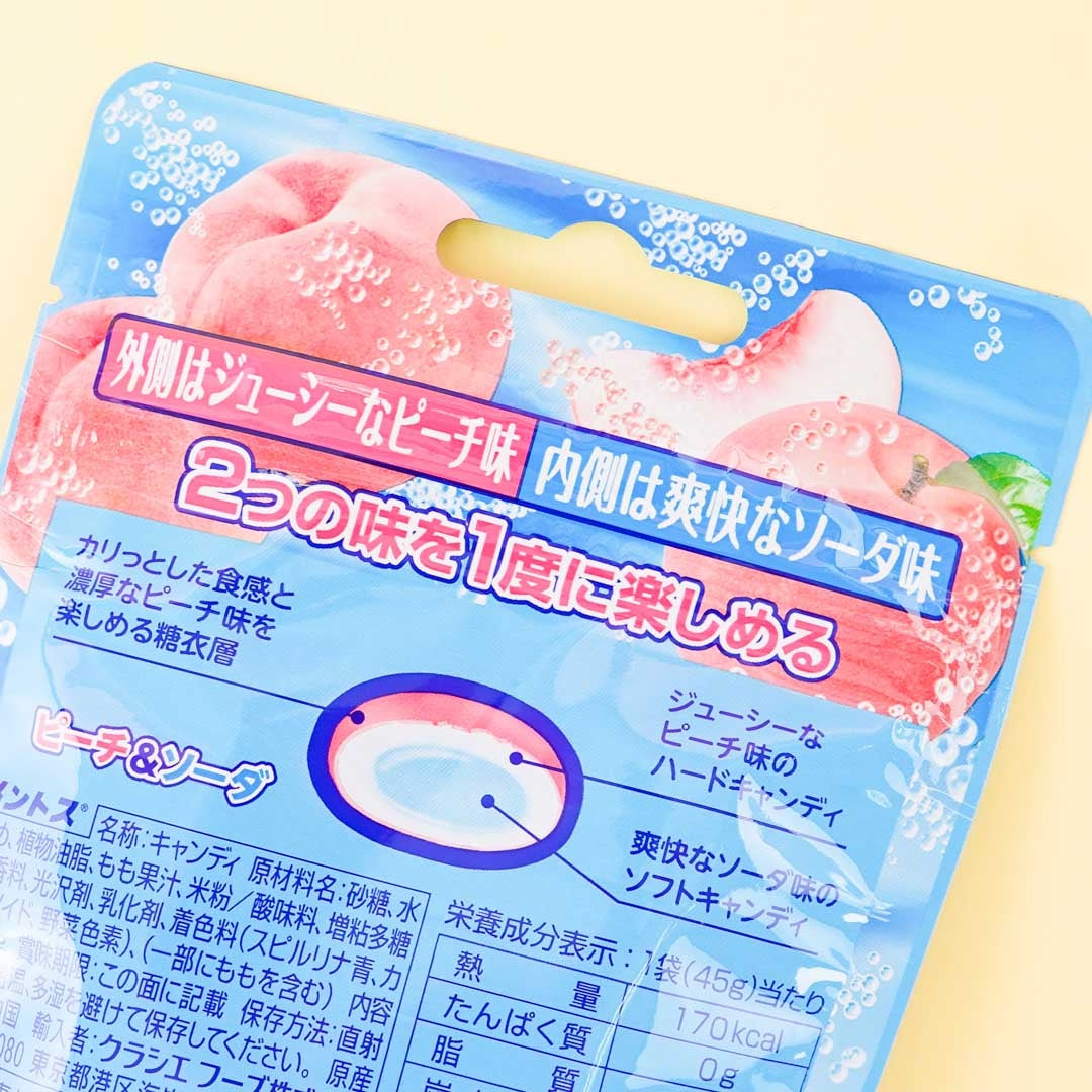 • A limited edition pack of peach-flavored sugar shell candy with soda soft candy filling