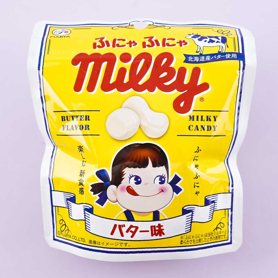 Treat yourself to this resealable pack of butter-flavored milk candy. It's made with rich butter from the region of Hokkaido! The pouch features a print of Milky candy's cute mascot, Peko-chan.