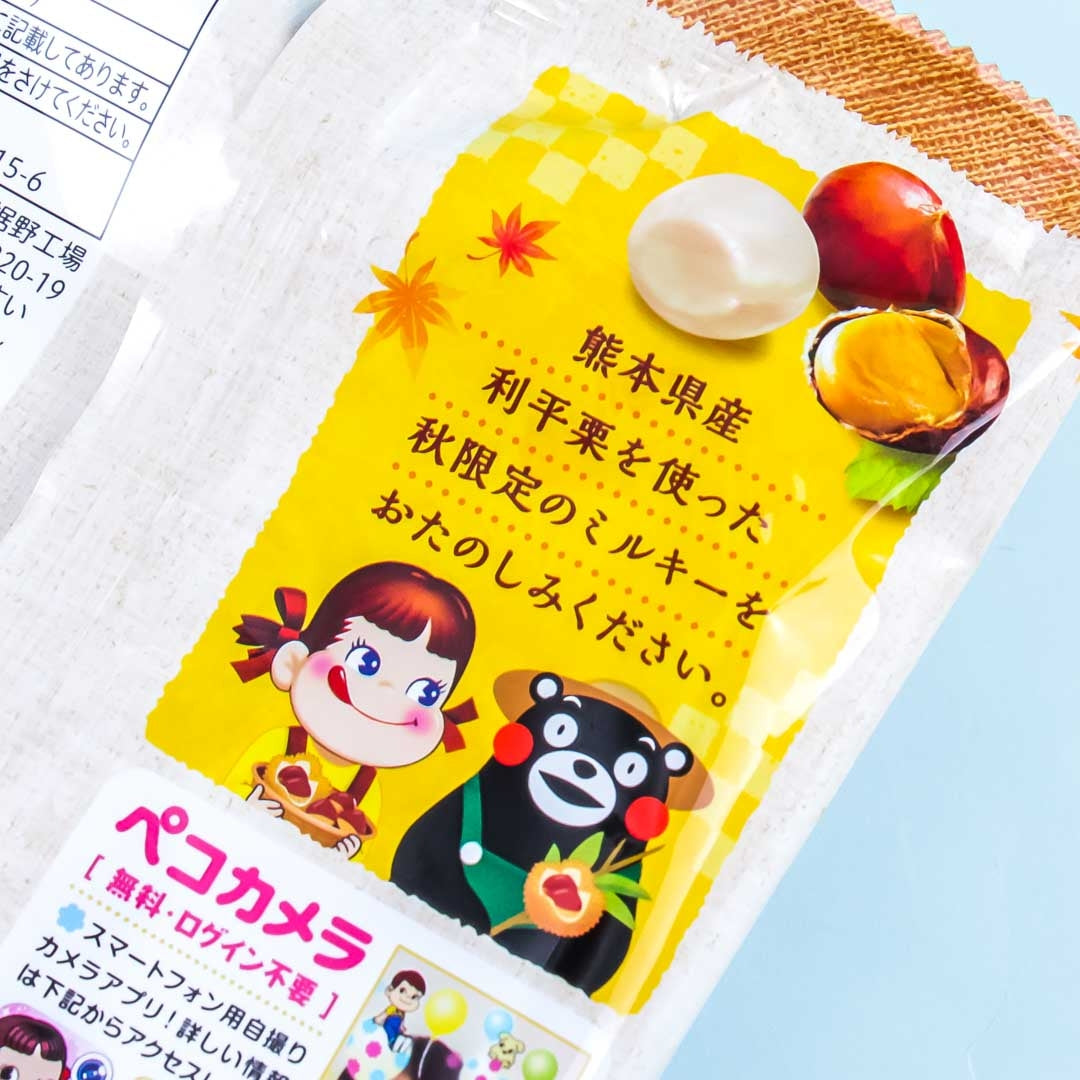 This does not have any chestnut taste at all. It tastes more like a Starbucks coffee turned into a candy. Individually wrapped like a toffee packet. It has a slightly burnt taste which is actually quite nice. It's quite large, about 2/3 the size of a full bag of chips in America. It's definitely the kind of candy you can empty in a bowl or share with others.