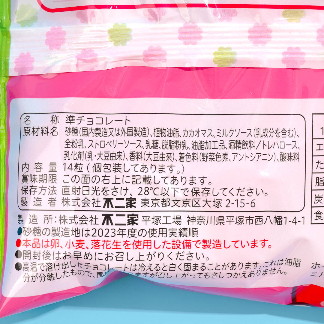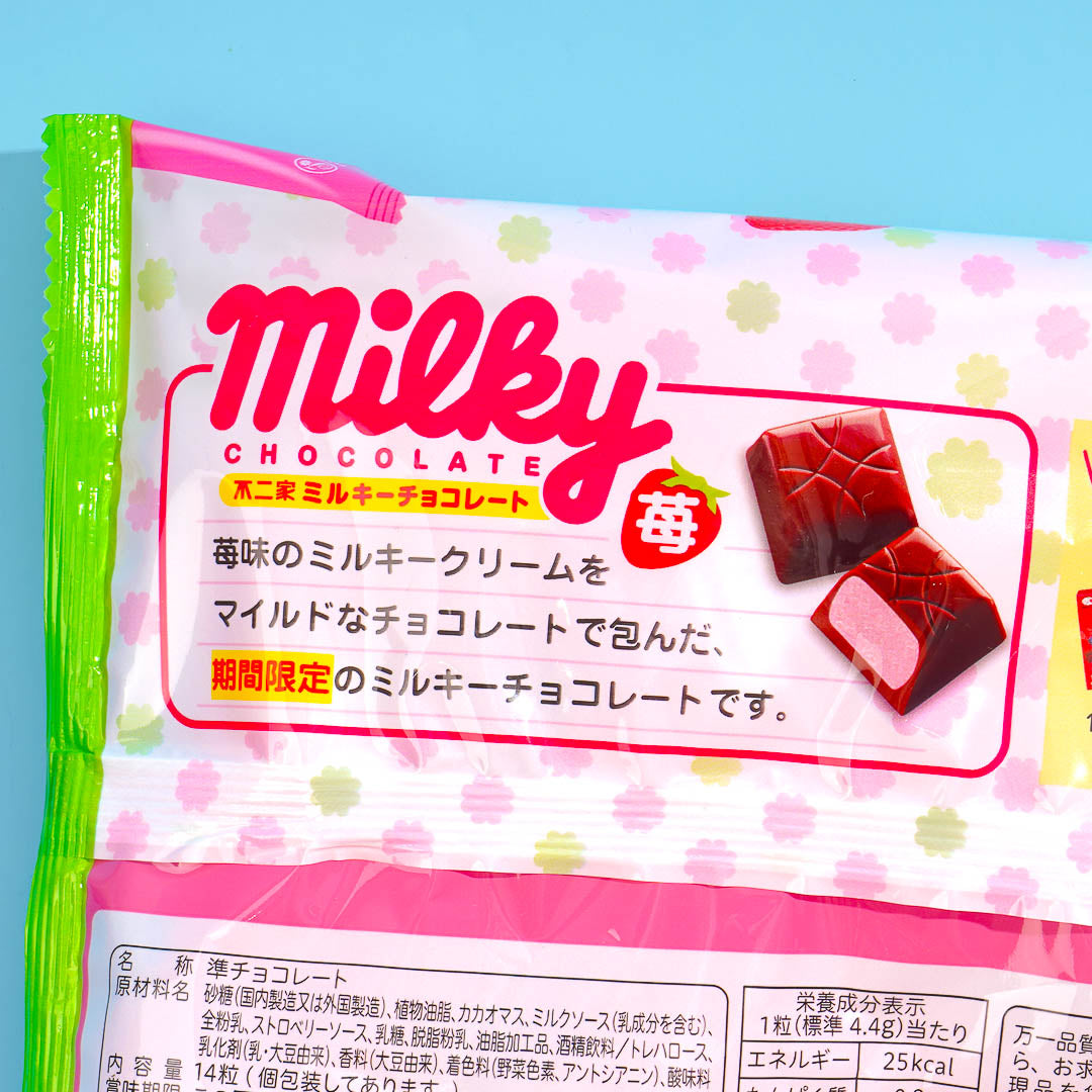 These bite-sized chocolates feature a rich, smooth chocolate shell filled with Fujiya's signature Milky cream and a delicious strawberry flavor. They come in cute packaging with an illustration of Peko-chan. Each piece is individually wrapped, so you can share some with your friends!