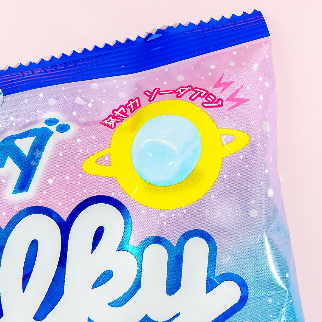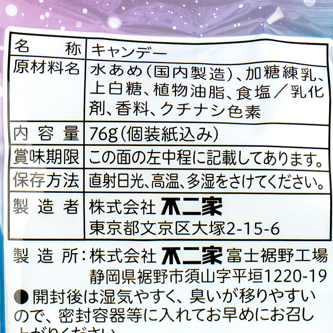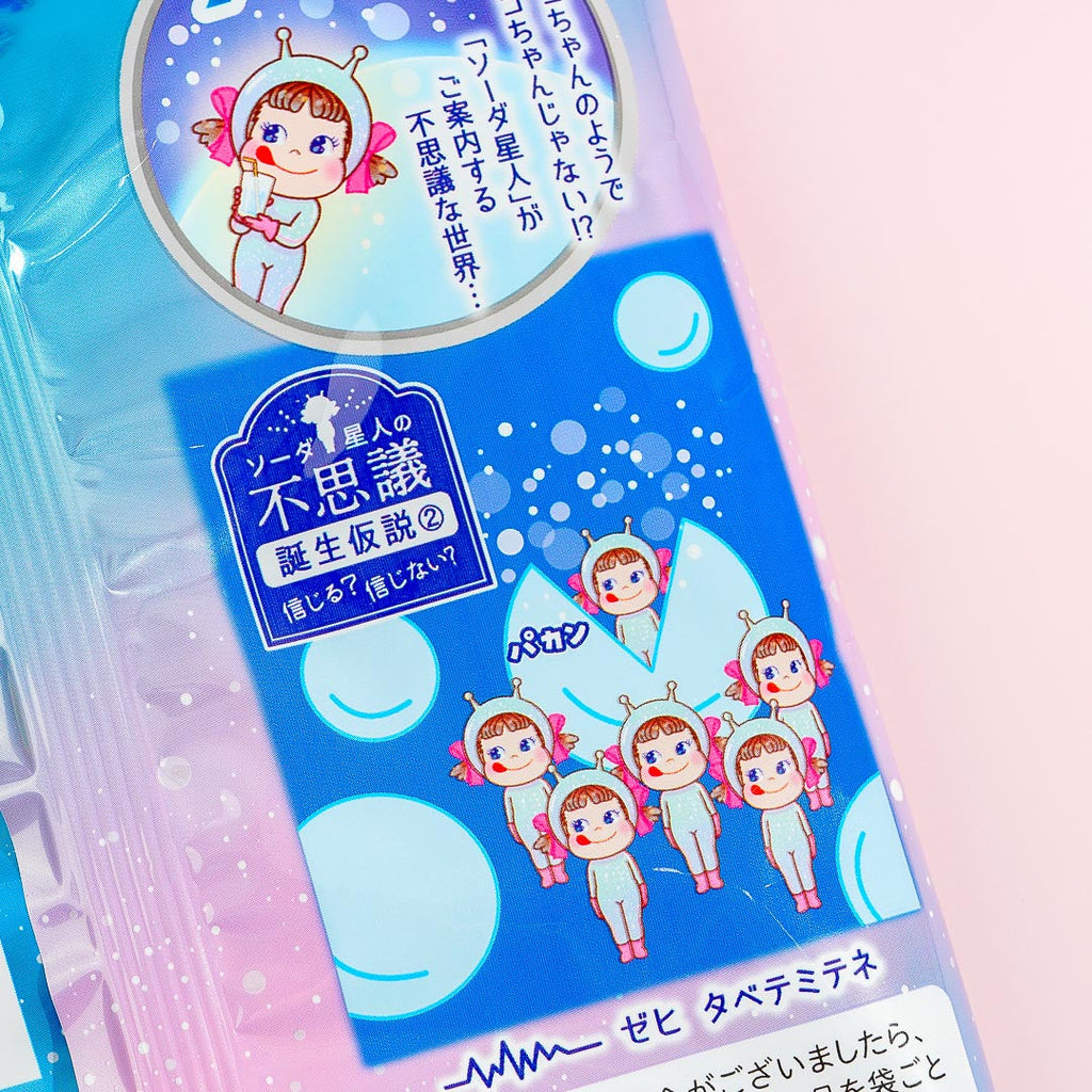 Enjoy munching on this limited-edition candy! It combines soda flavor with gentle condensed milk to create a refreshing taste The candy has a bluish-white color and comes in a packaging that features an alien who looks like Peko-chan.