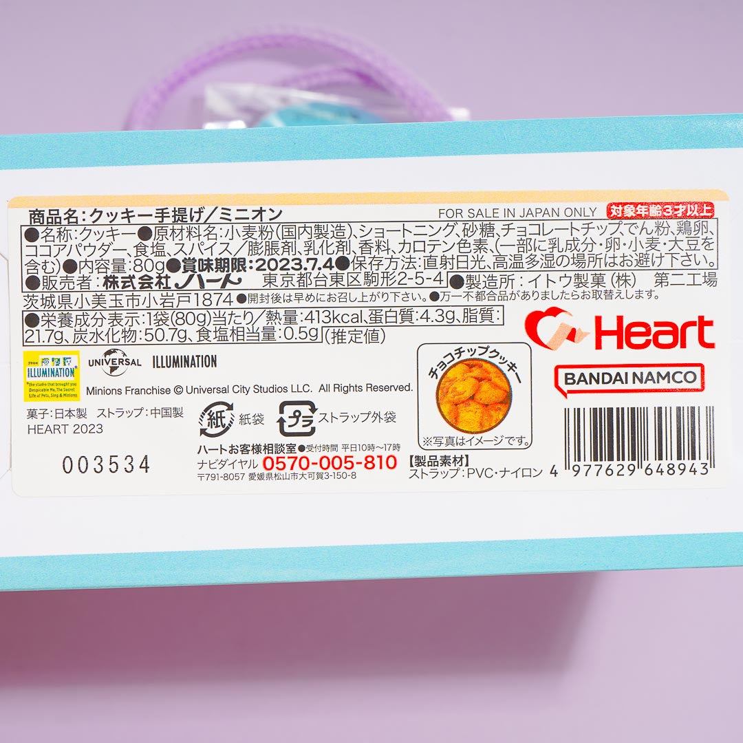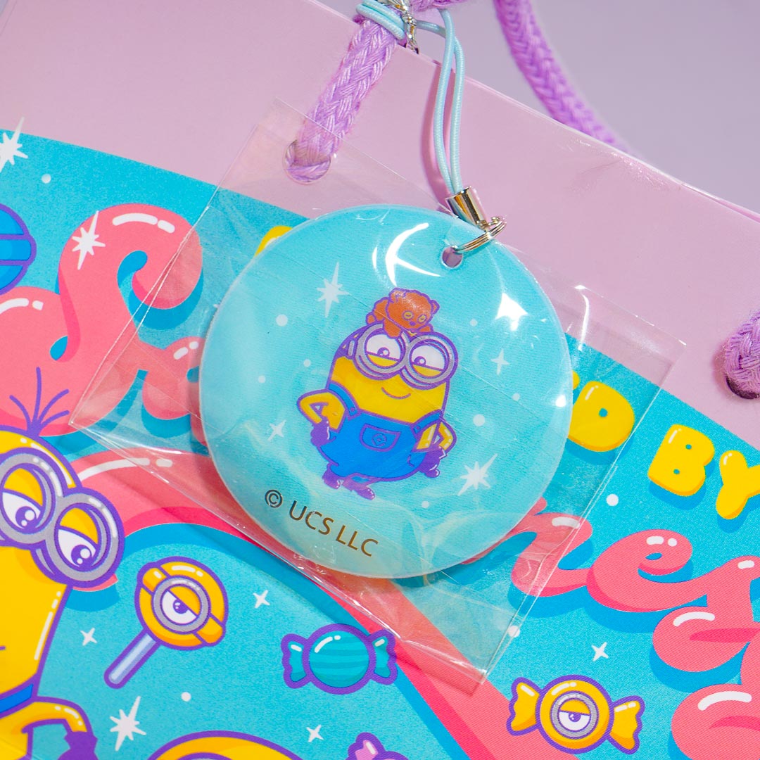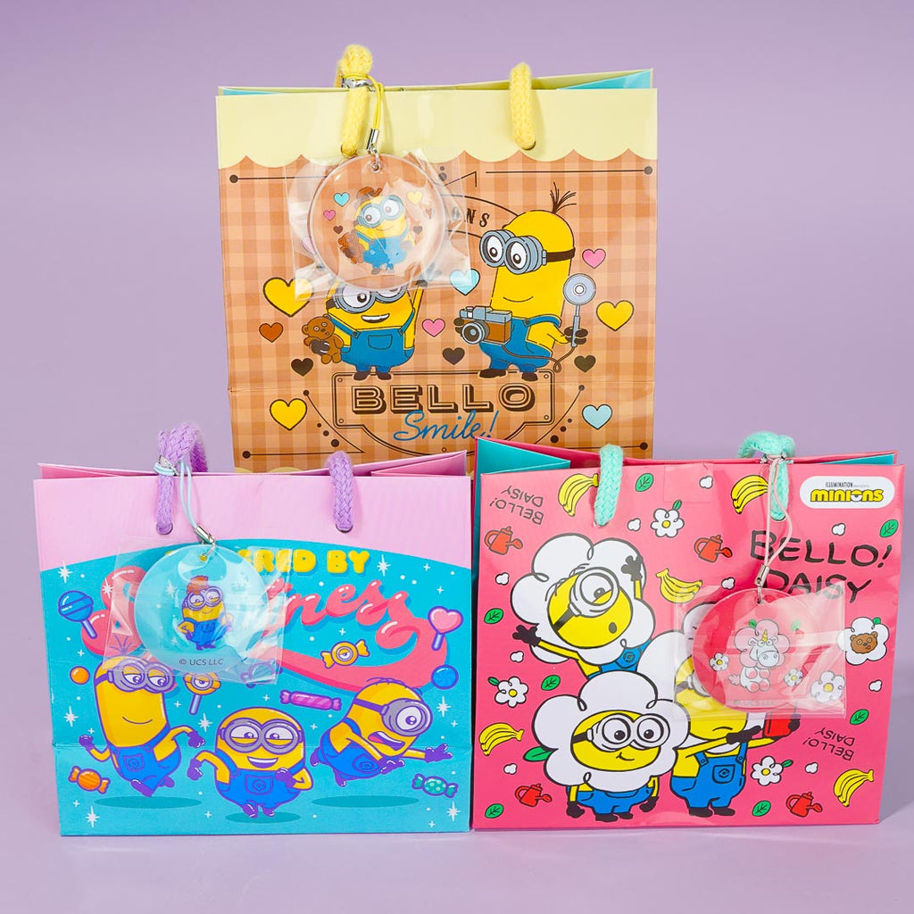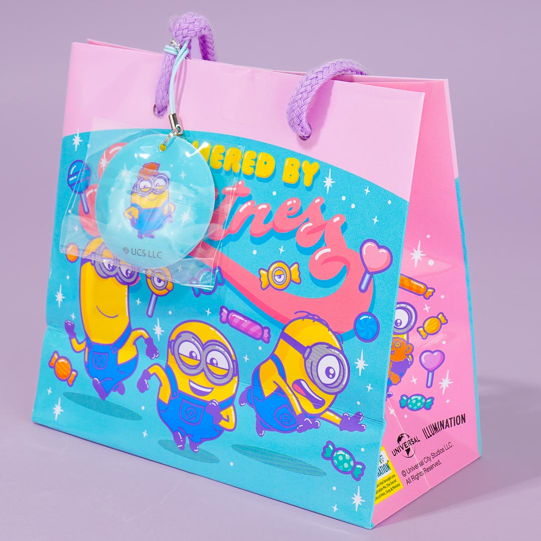 Gift your special someone with this bag filled with choco chip cookies! The paper bag that comes with the set has kawaii prints of the Minions surrounder by lots of candy! This set also comes with a round charm with a matching print.