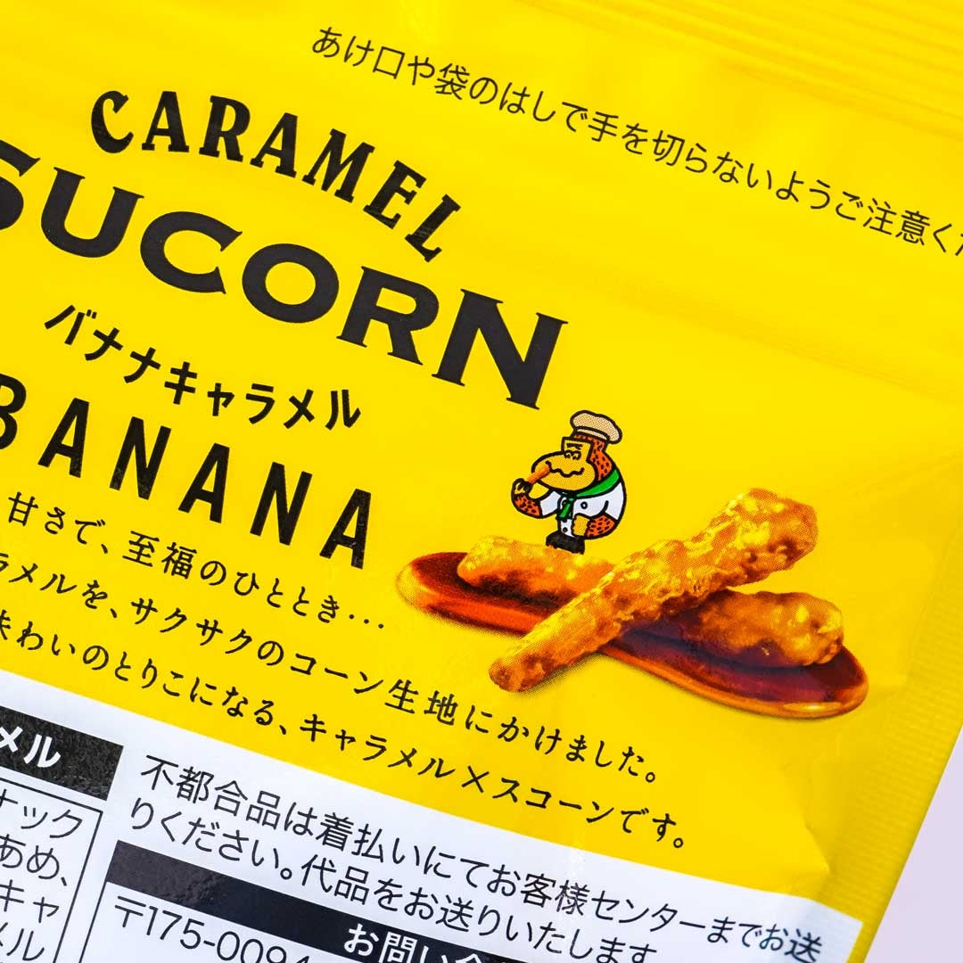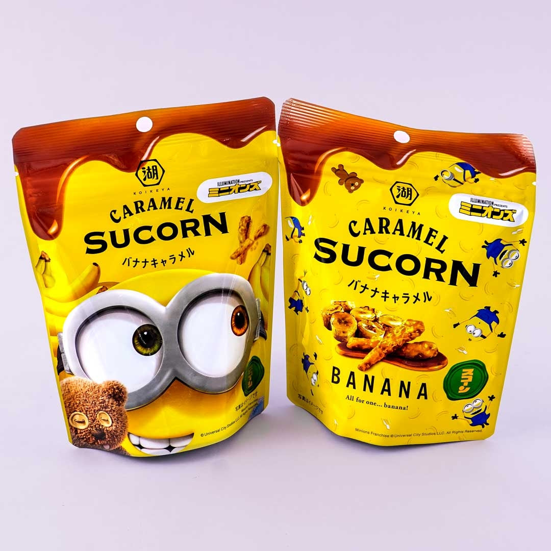 • A resealable pack of banana caramel-flavored corn snacks featuring pritns of the Minions