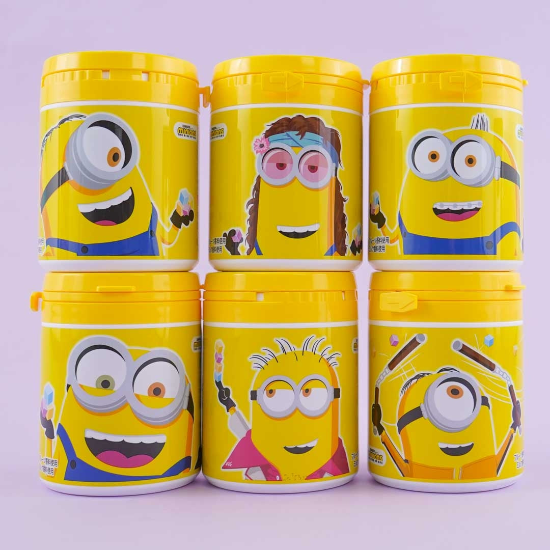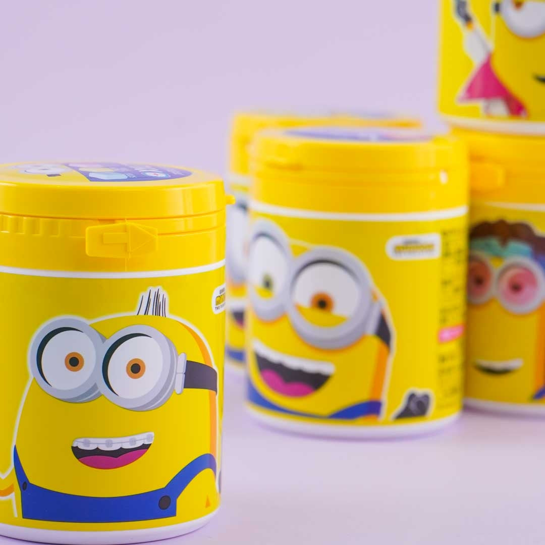 This bottle of xylitol gum features prints of the Minions from the Despicable Me franchise! Surprise yourself with a random package design when you order. it has soda, lemon soda, grape soda, and banana shake flavors.