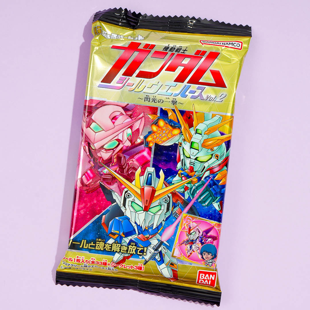Have fun collecting stickers featuring illustrations of the characters and mobile suits from Gundam! This pack comes with a delicious cocoa cream wafer that you can munch on while watching the Gundam series.