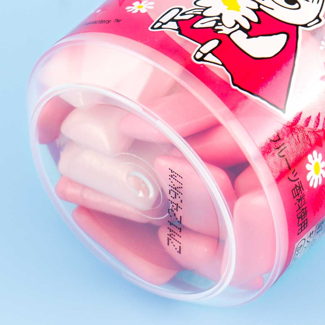 A container of Moomin peach and cherry-flavored chewing gum made with xylitol