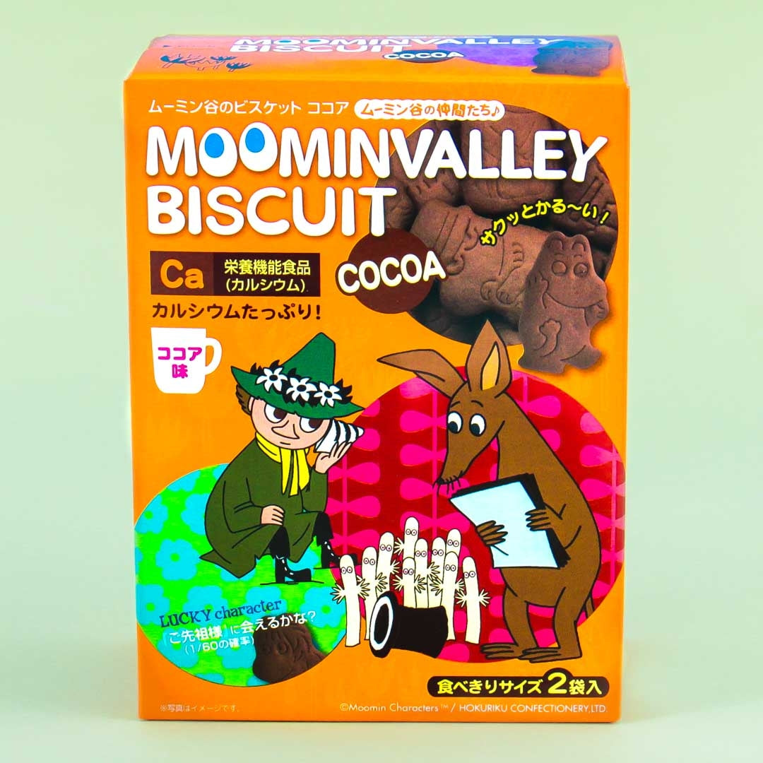 Enjoy these crunchy and delicious biscuits with Moomins! Each biscuit has a Moomin character being cute and funny. Guess which character you'll pick next - maybe it will be the lucky character - "The Ancestor Moomin!" The package includes 2 sets of cocoa flavored biscuits with an added pinch of calcium! A lovely gift or a special treat for yourself!