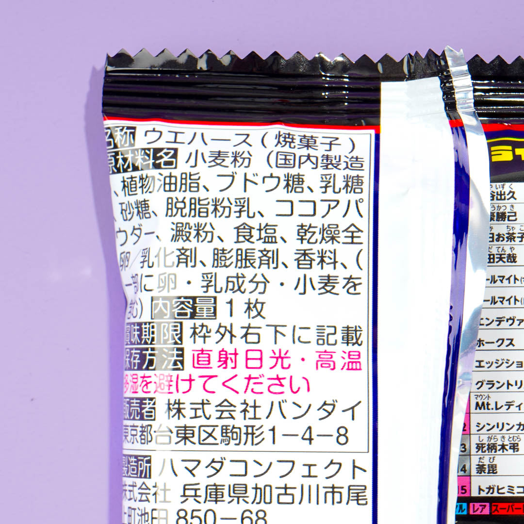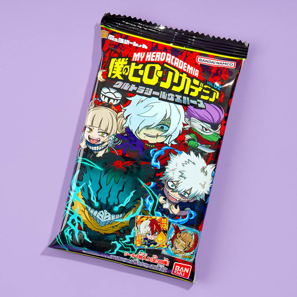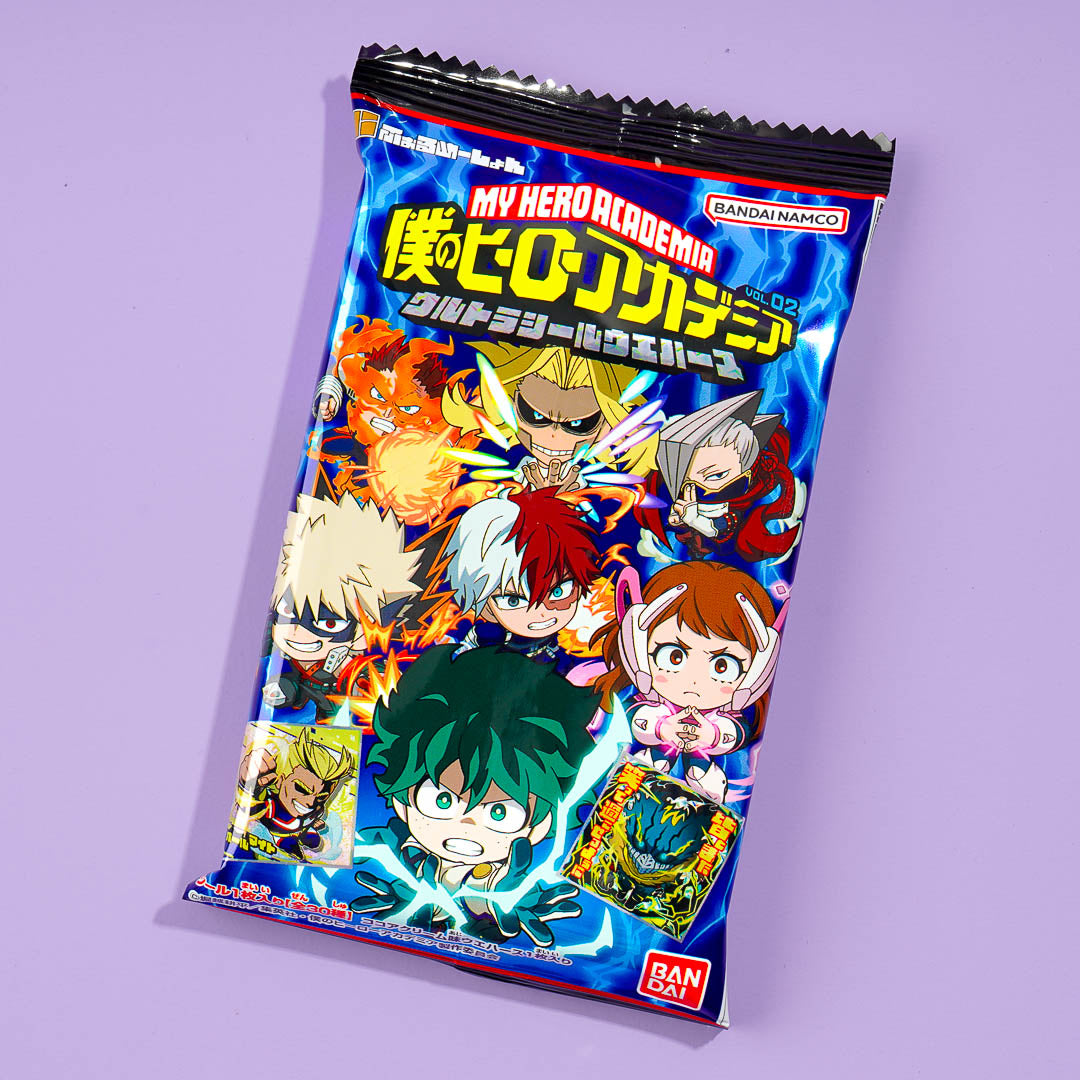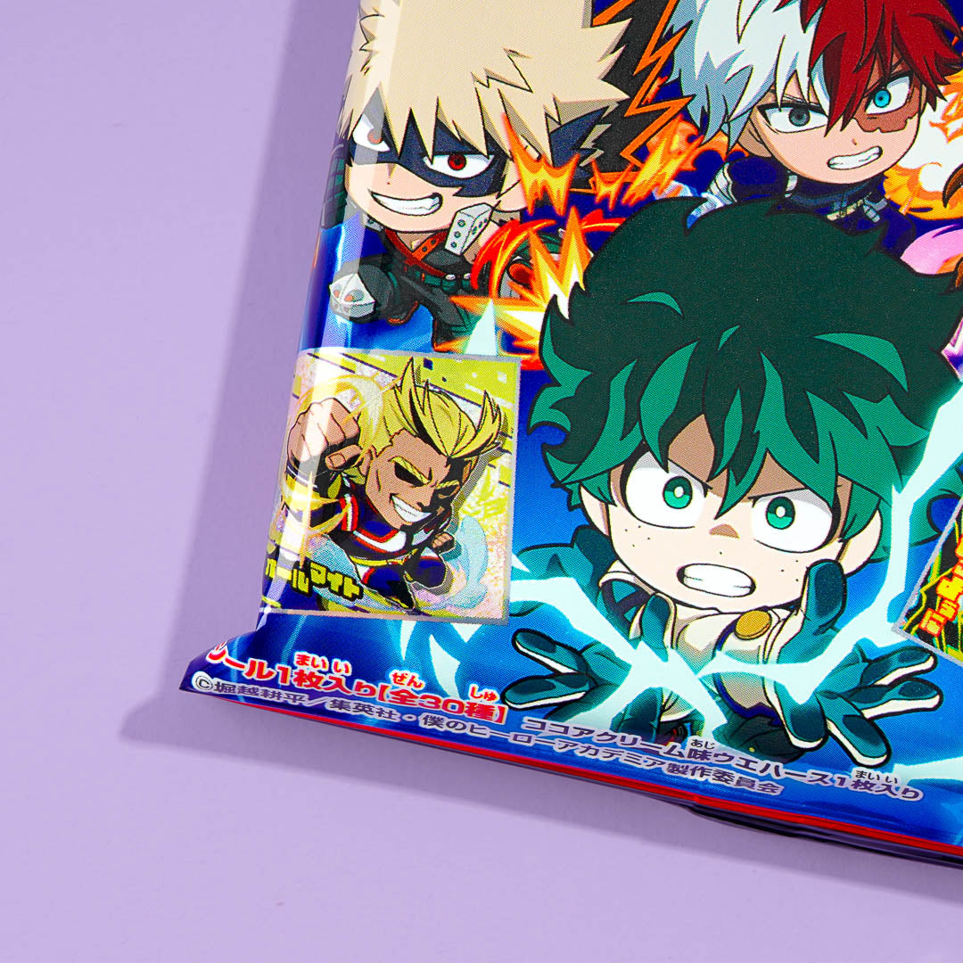 This chocolate-flavored wafer is the perfect snack for anime lovers! It comes with a metallic sticker that features a kawaii illustration from the anime My Hero Academia.