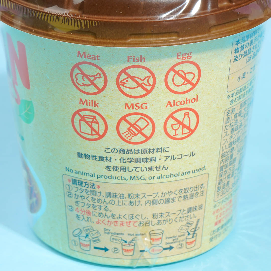 Fill yourself up with some nice Japanese noodle soup! This cup of instant noodles makes for a nice hot soup with the right amount of acidity and spice from pepper and chili oil. It's a nice vegan treat that doesn't use any animal products.
