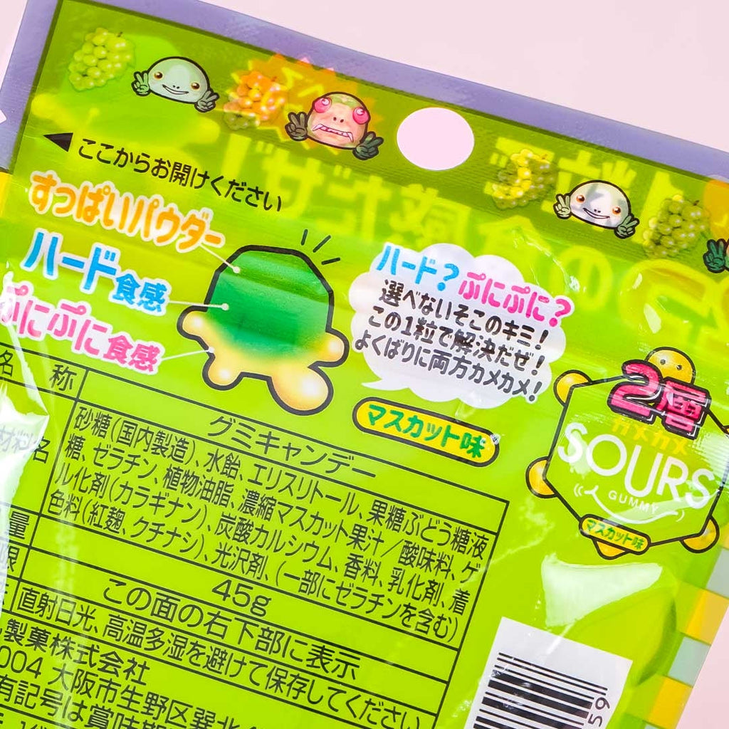 • A resealable pack of muscat-flavored gummies shaped like turtles coated in sour powder