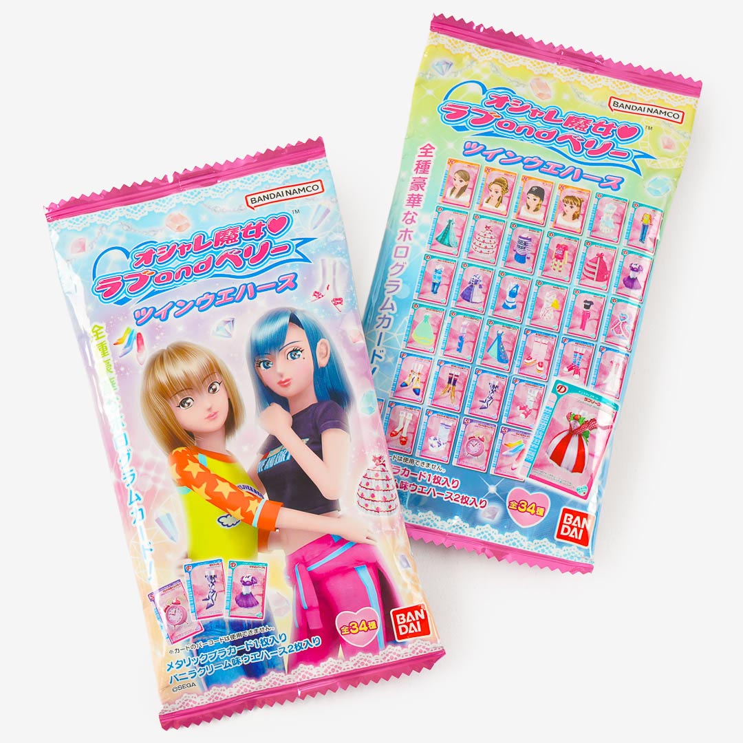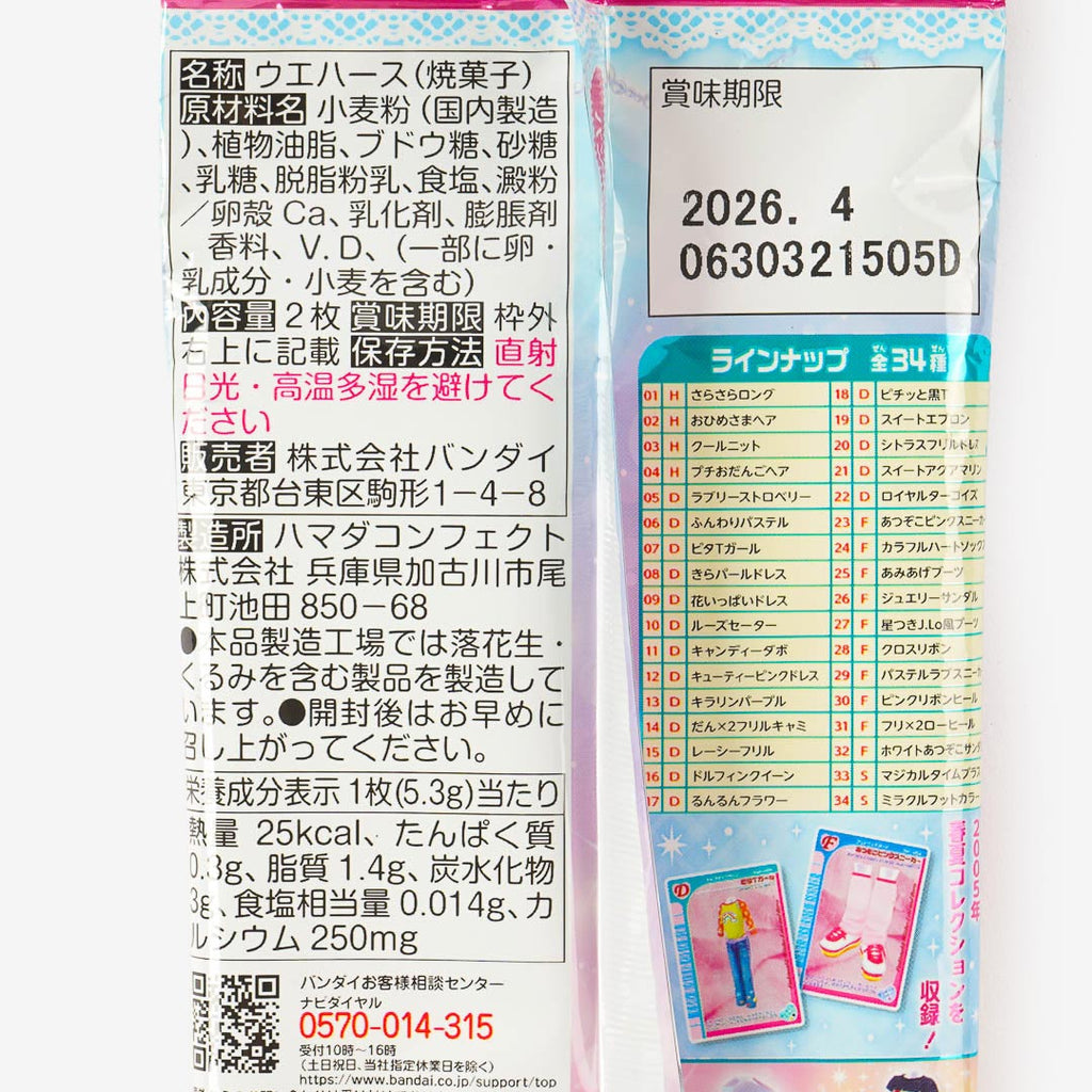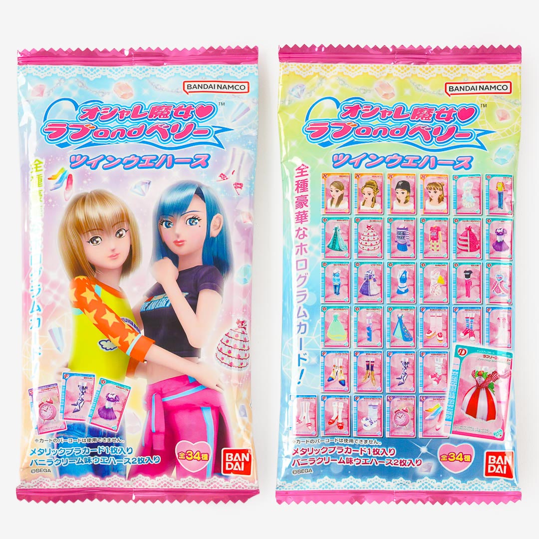 This pack of twin vanilla cream-flavored wafers features prints of characters from the classic 2000s game Oshare Majo Love and Berry. Take it along with you as an emergency snack when heading to gaming conventions! Inside, you'll find a collectible Oshare Majo card. Surprise yourself with a random card from a set of 34 different designs.