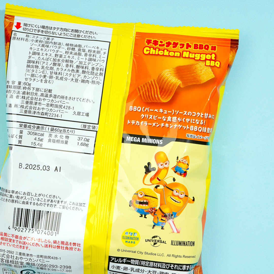 Tuck away this pack of wavy ramen noodle snacks in your cupboard! It features prints of characters from the Minions franchise dressed up as secret agents. Enjoy the delicious taste of chicken nugget BBQ with every bite.