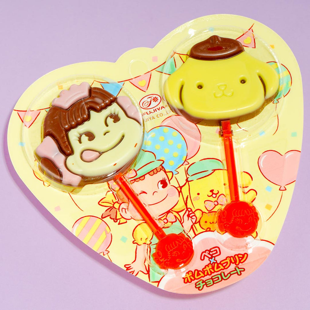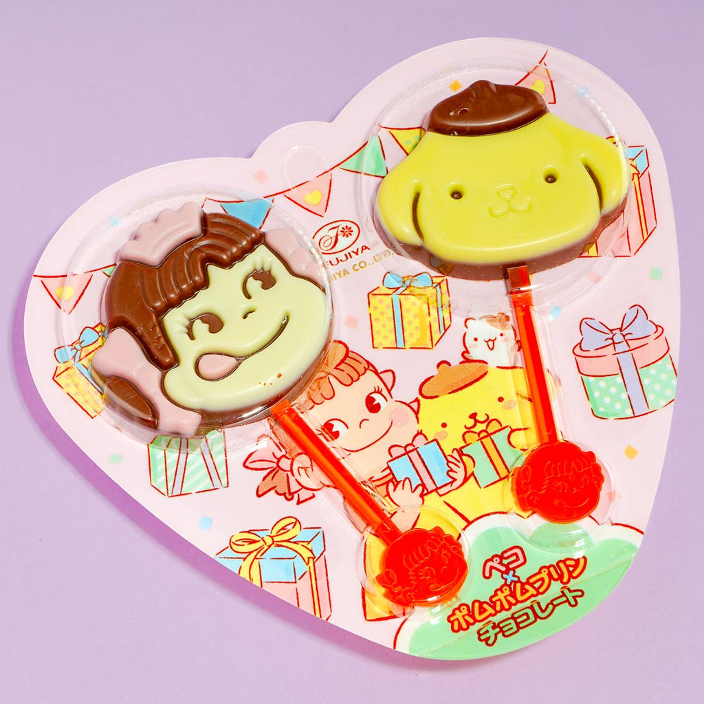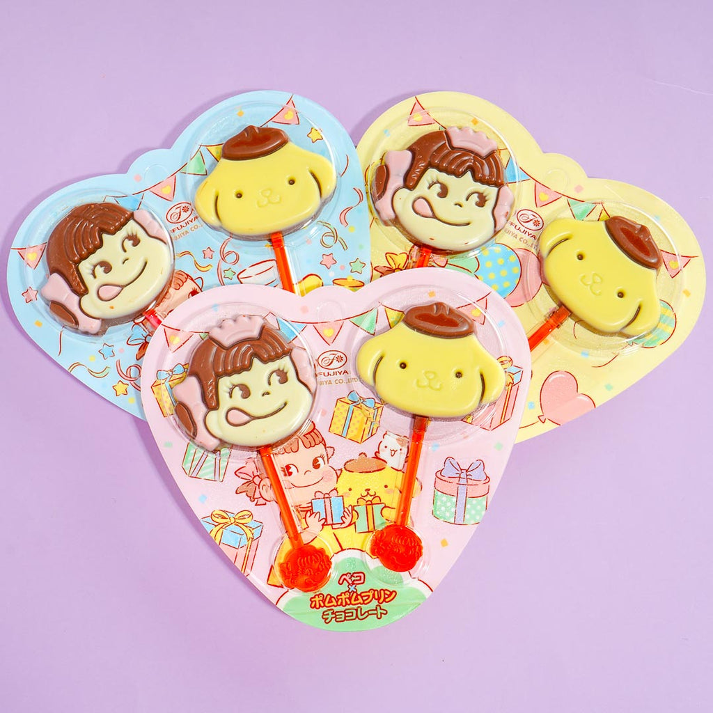 Split these colorful lollipops with your bestie! One of the chocolate treats has a Pompompurin print, while the other has an illustration of Peko-chan, the iconic mascot of Milky Candy.