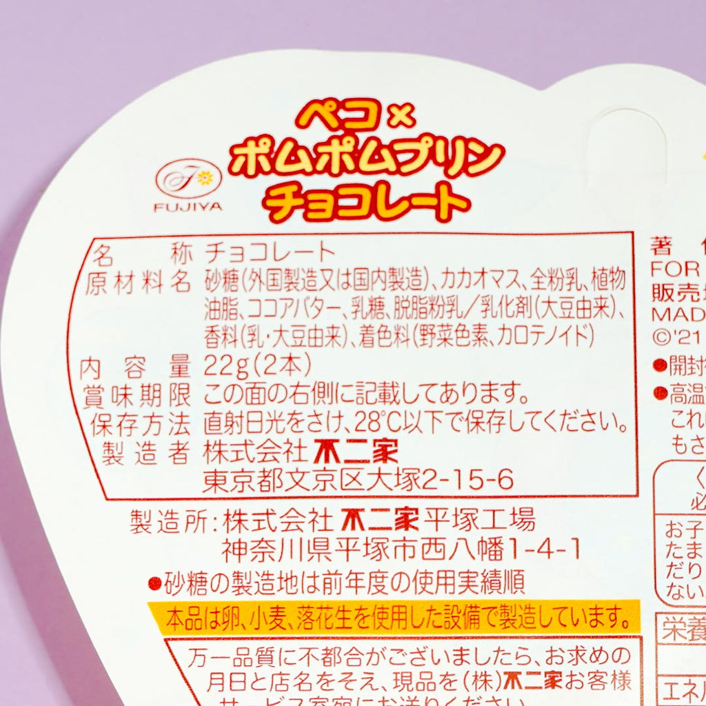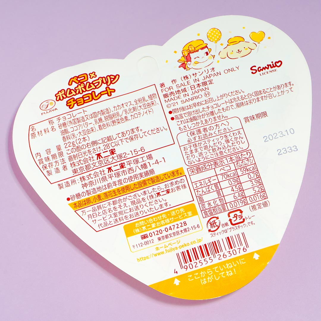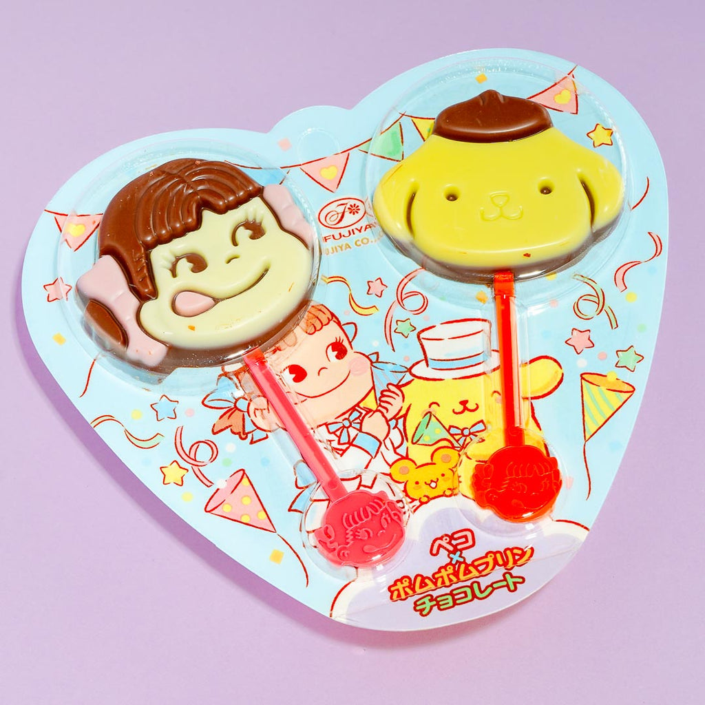 Split these colorful lollipops with your bestie! One of the chocolate treats has a Pompompurin print, while the other has an illustration of Peko-chan, the iconic mascot of Milky Candy.